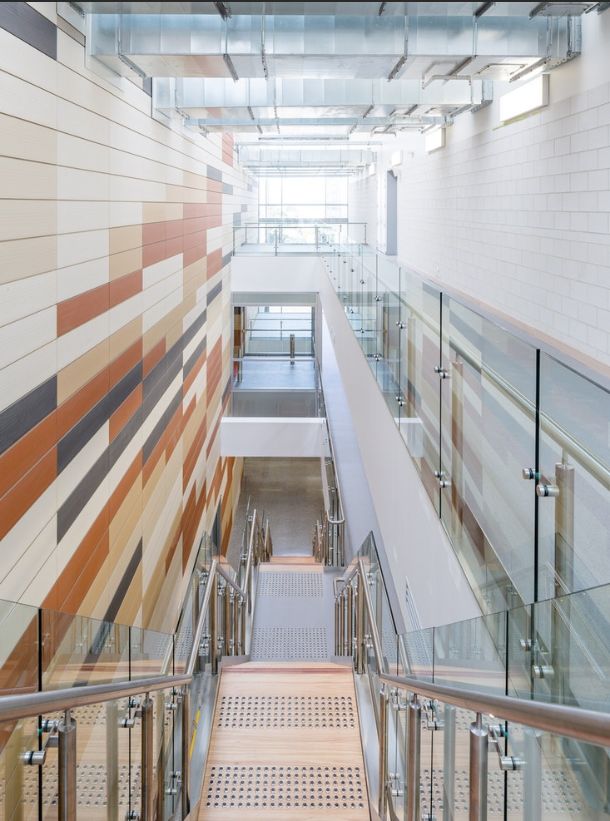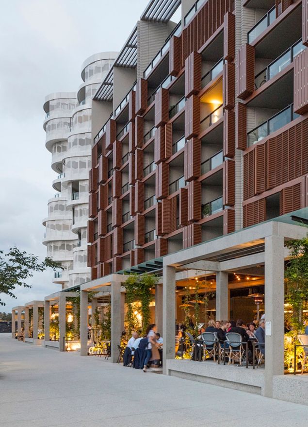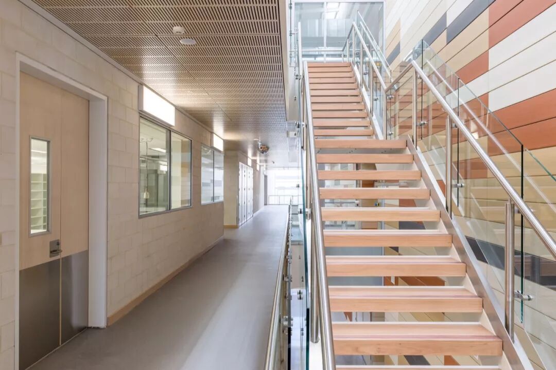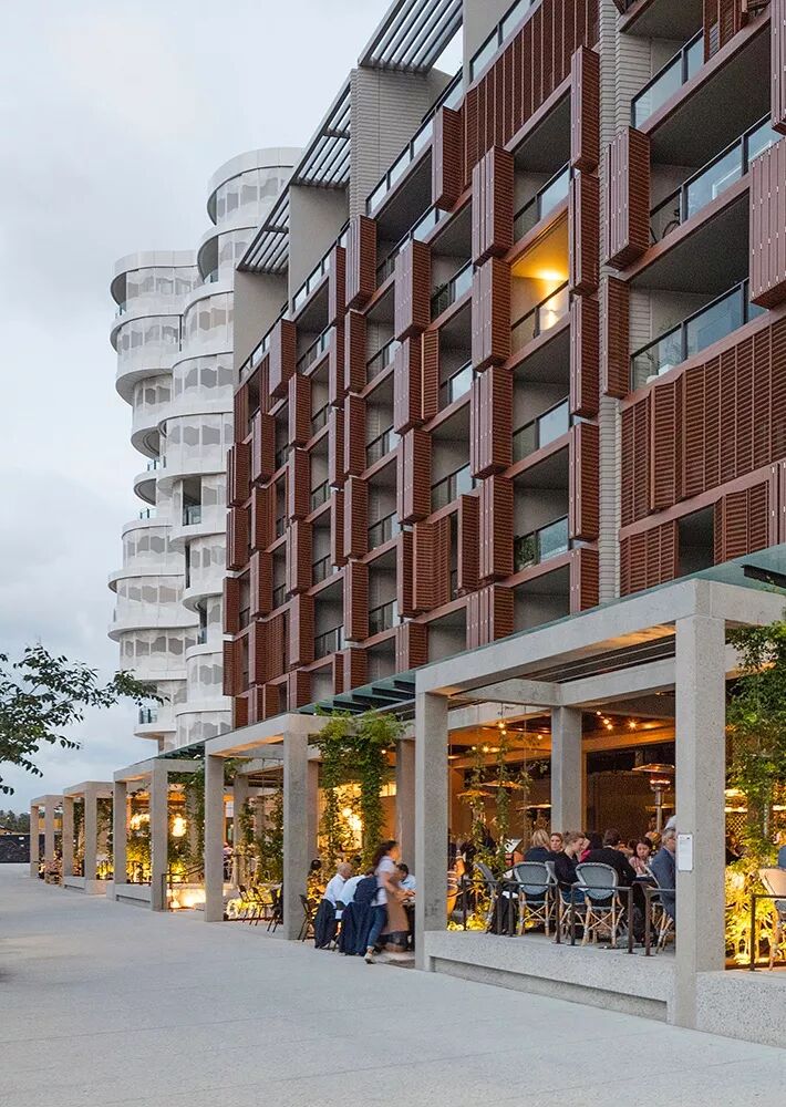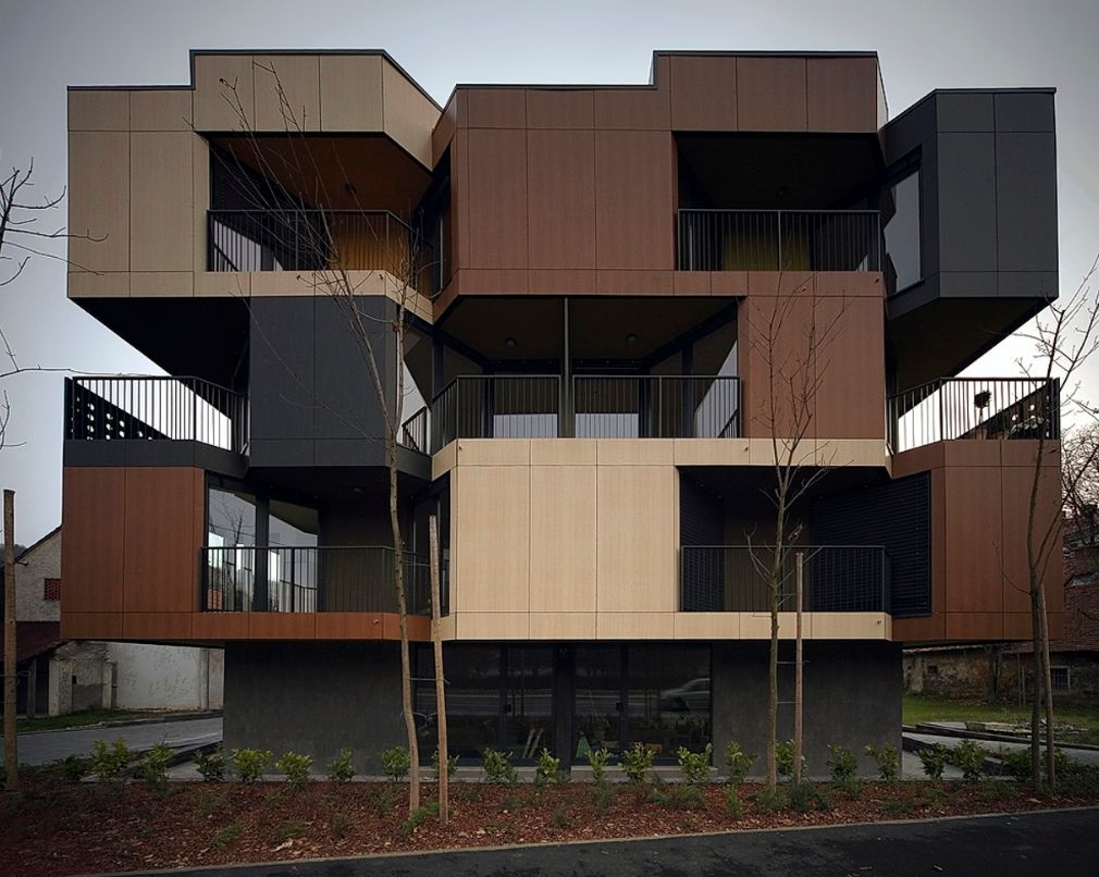 公寓的外墙采用的是预制墙板,这些墙板援用了木制的三种颜色,沿垂直方向错落设计。