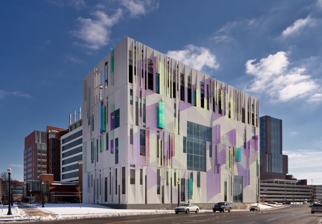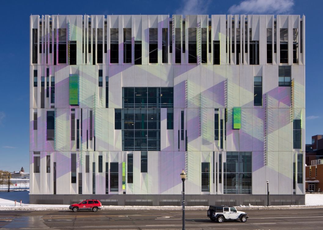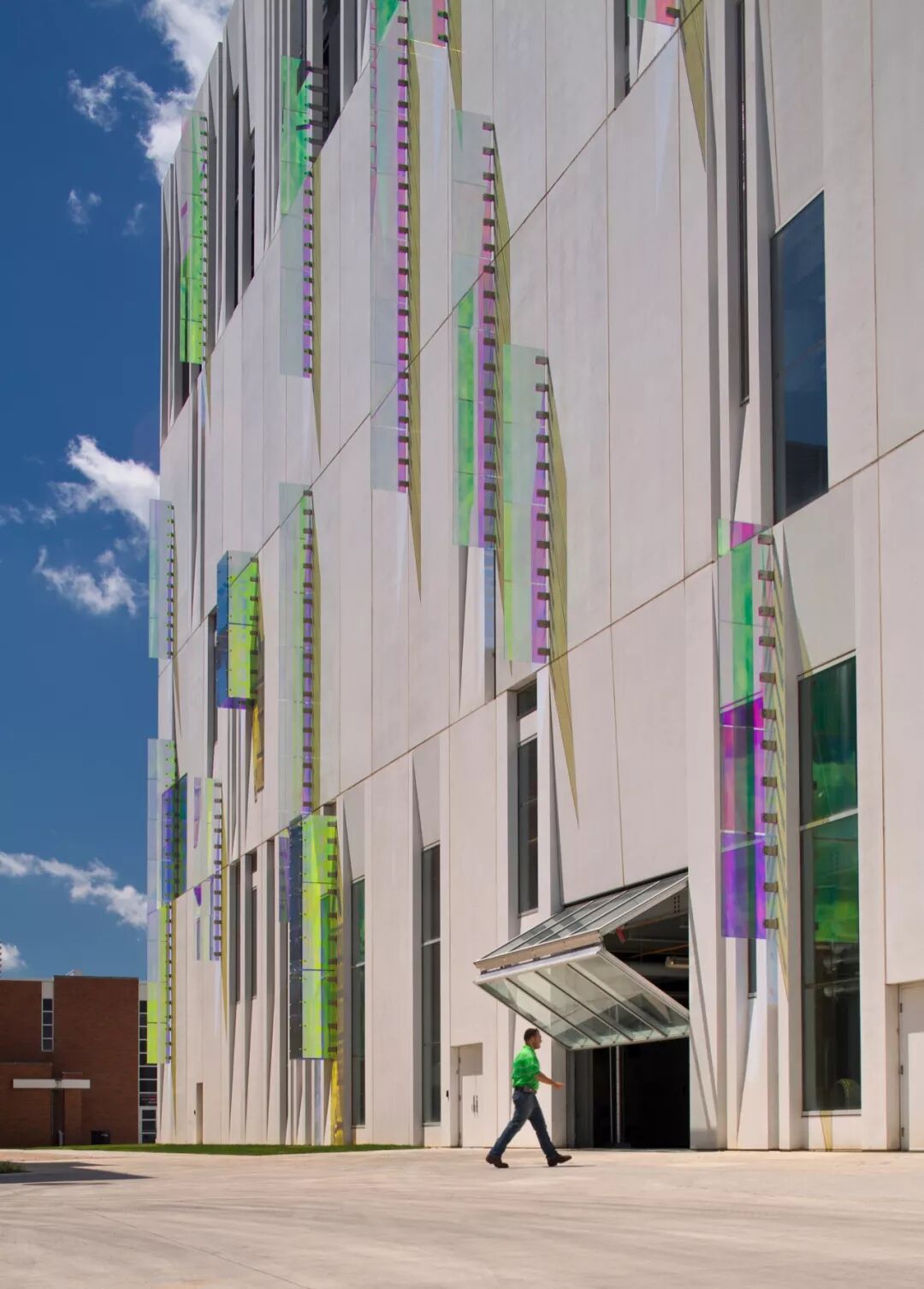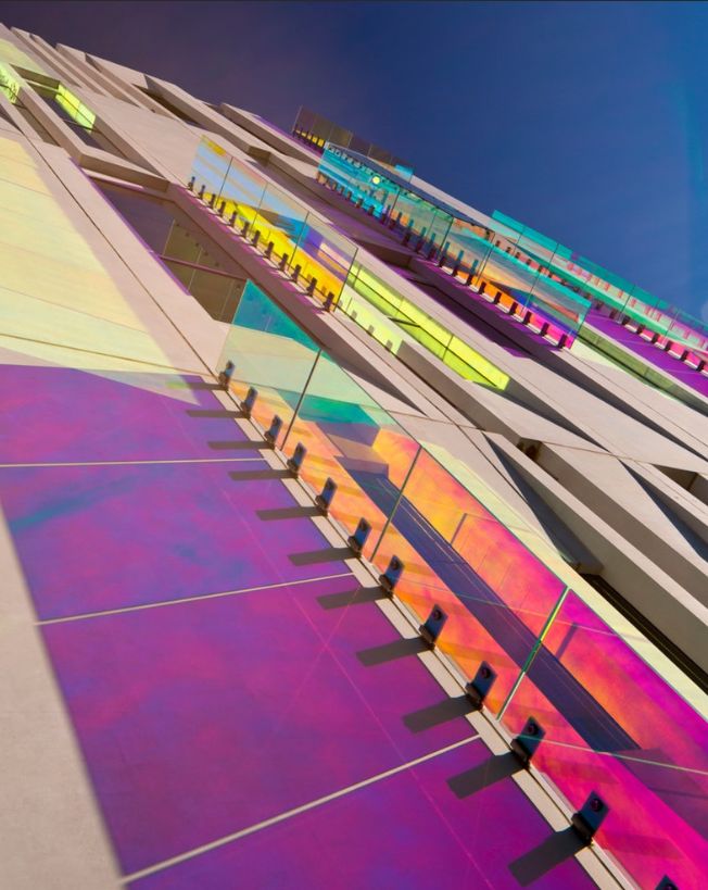 新制冷大楼外墙材料采用了高抛光的混凝土预制墙板,这些墙板会随着太阳的移动而变色。