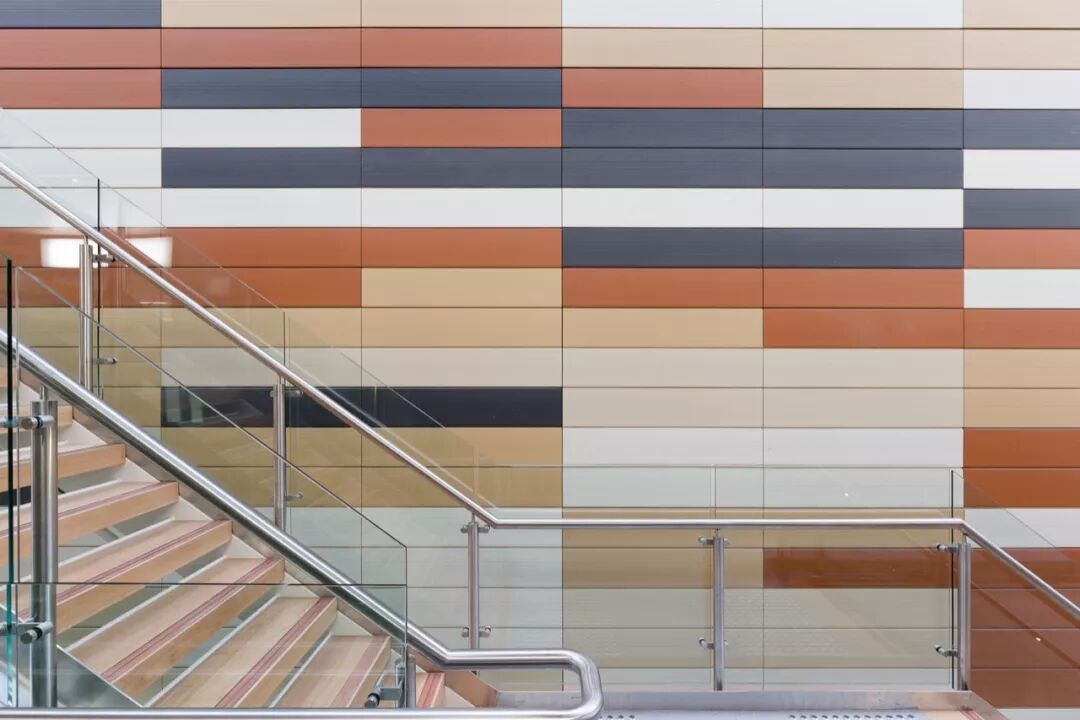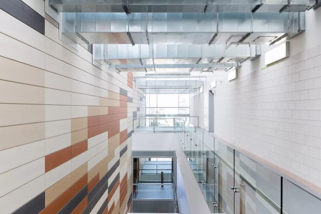 建筑南外立面用朴实的赤陶土彩色立面与天空形成鲜明对比。