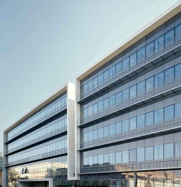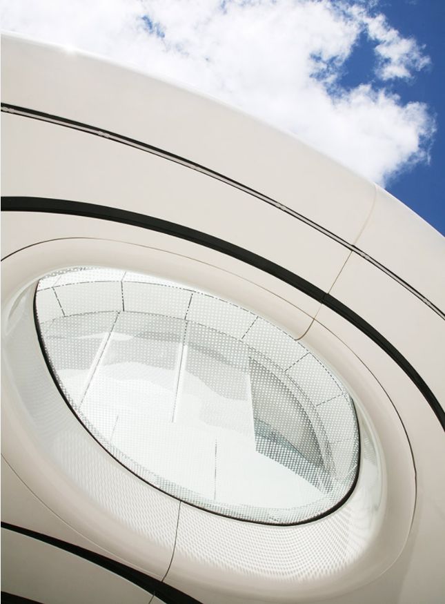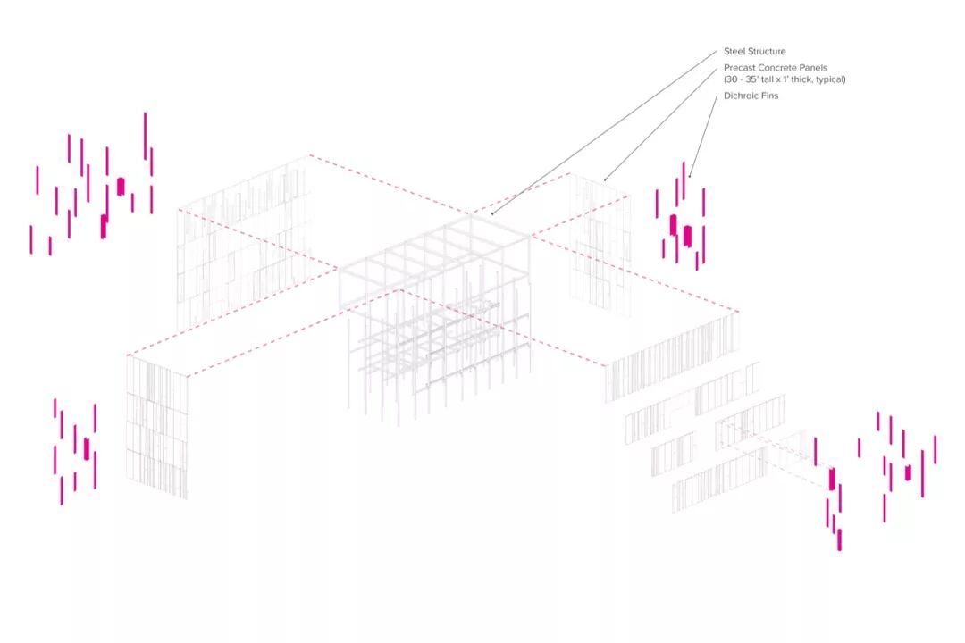 而南部立面在玻璃幕墙外侧由特殊的预制混凝土保护,这些白色预制混凝土板错落排布,能起到遮阳、防风等功能。