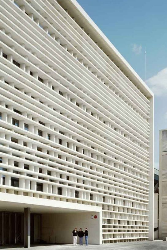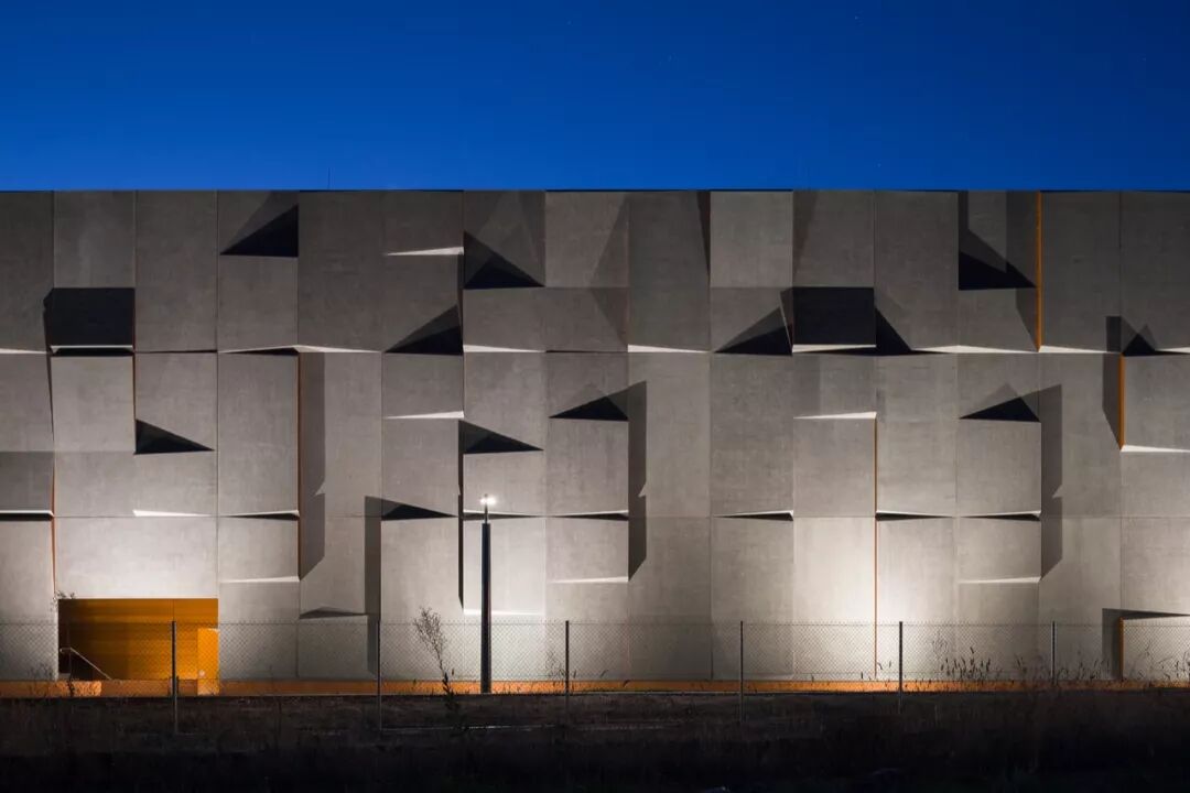 建筑外立面由预制混凝土板组成,凹凸的立根据不同时间的阳光照射,投射出太阳角和阴影。