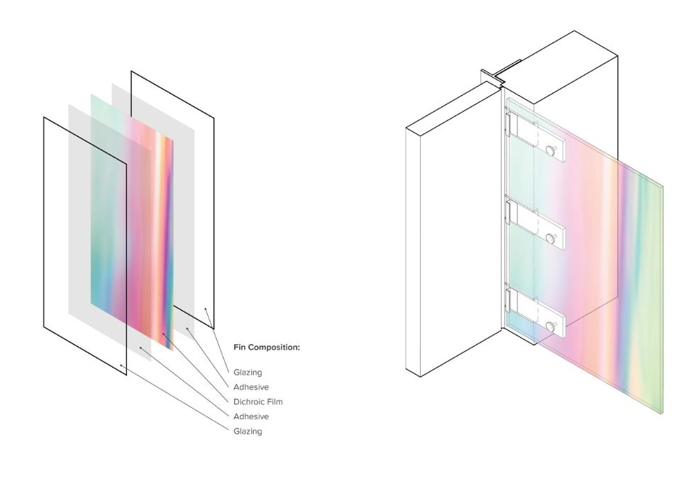 这些墙板的北边缘和南边缘分别带有黄昏和黎明色的鳍片,这些鳍片巧妙地吸引通勤者以思考时间的流逝。