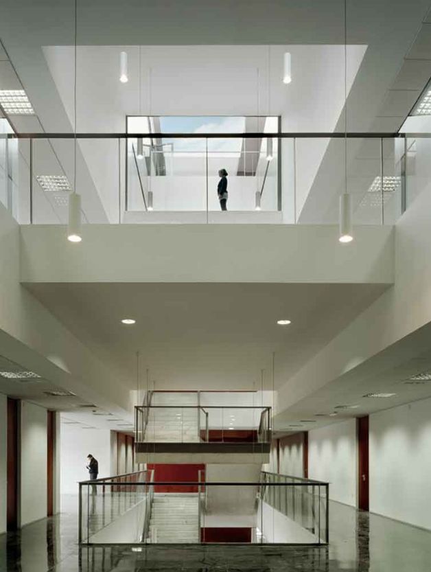 该建筑分为两个平行的教室和办公室,分别与南北立面相连,中央空间有流通,开口和露台,有利于光线的进入并产生对角线景观。
