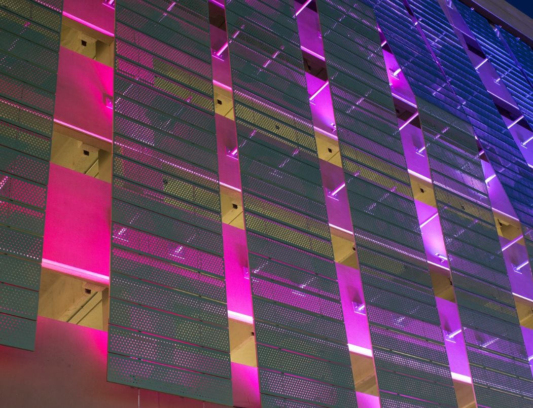 停车楼在设计时,水平带较长的预制混凝土结构与装饰性金属屏风相对立。用金属丝网帆布制成的坡道坡度传达角度。