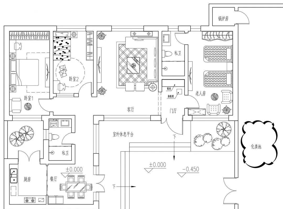 庭院部分的设计注重于整体功能,装饰和景观部分则通过简单的绿植装饰增强院内的自然气息。休闲平台与庭院存在数级踏步的高差,既起到划分庭院空间的作用,又可实现雨天防积水的实际功能。