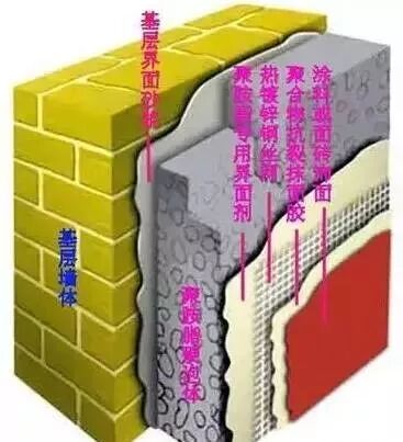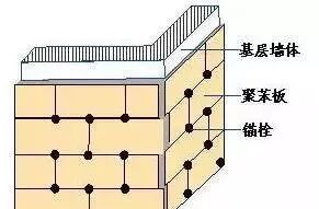 基层处理→测量放线→粘贴EPS聚苯板→聚苯板打磨→涂抹面胶浆→铺压耐碱玻纤网格布→涂抹面胶浆→涂耐水弹性腻子→面层涂料或面砖施工。