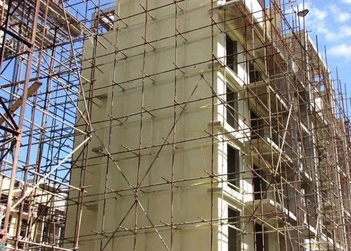 钢丝网架聚苯板在工厂预制成块体,现场根据排板尺寸裁割拼装,外墙主体与保温层一次成活,工效提高,工期缩短,施工安全。