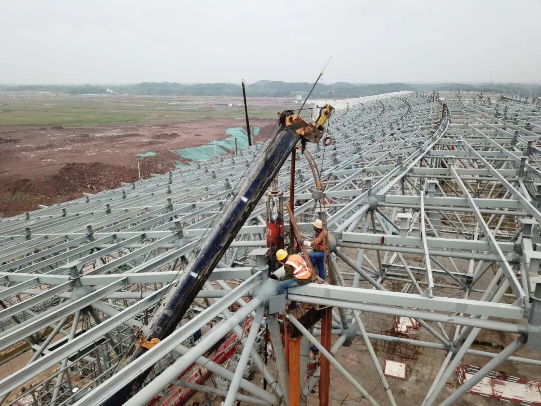 近日,随着成都天府国际机场T1航站楼的最后一片网架提升就位完成,至此,由中建钢构有限公司承建的国家“十三五”期间规划建设的最大民用机场——成都天府国际机场T1航站楼钢结构工程提前一个月实现全面封顶,献礼新中国成立70周年。