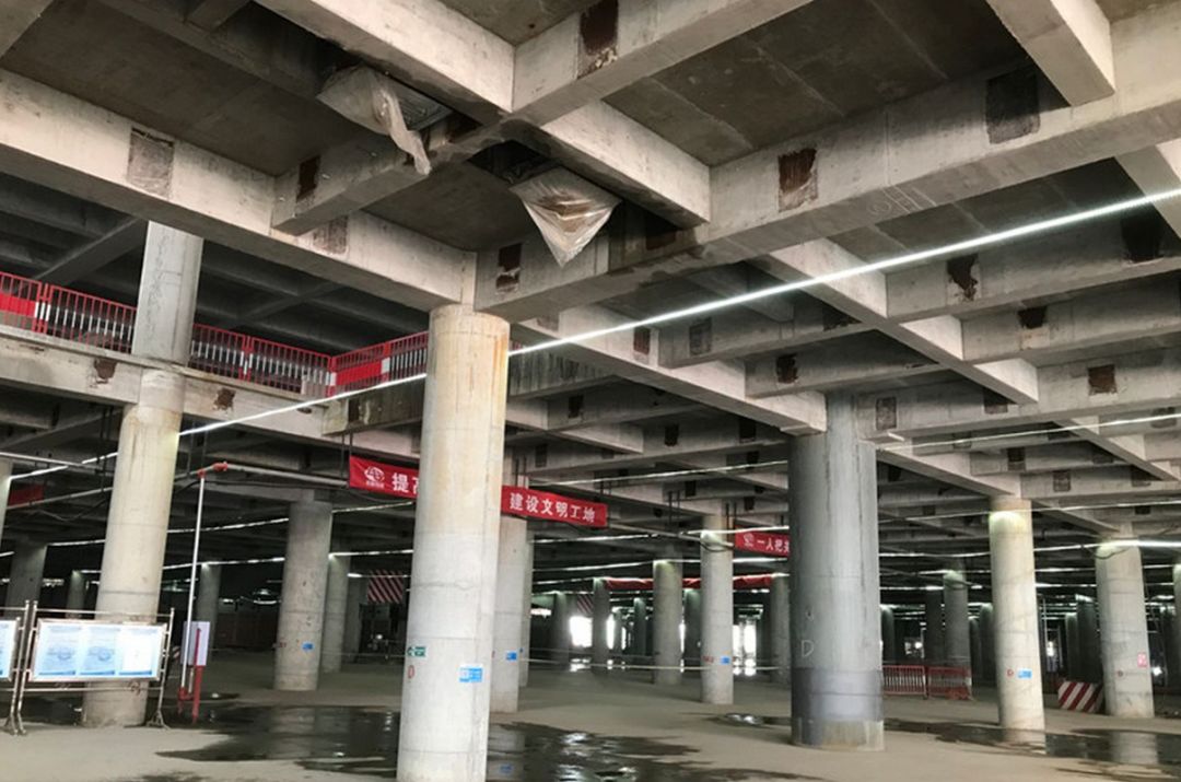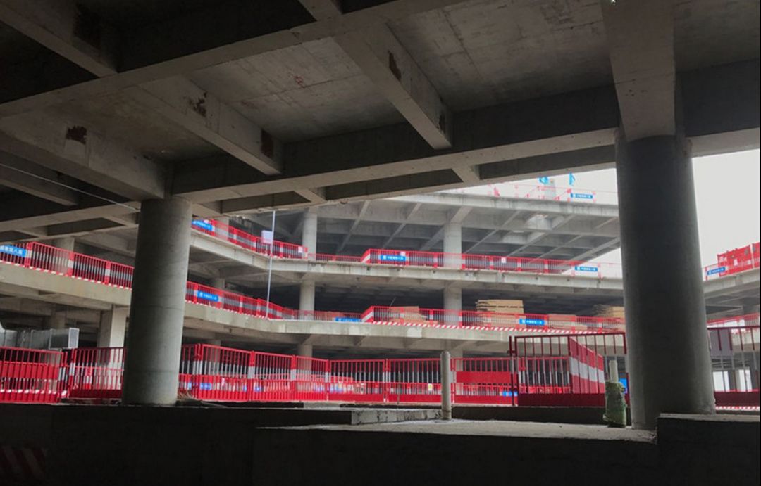 在进行航站楼下穿高铁施工时,由于航站楼下的高铁区段是不减速下穿,高铁时速达350公里,因此这个区域的高铁顶板厚度厚于其他。3米的顶板厚度且为异型渐变双曲弧形顶板,这样的施工难度在全国也是首例。