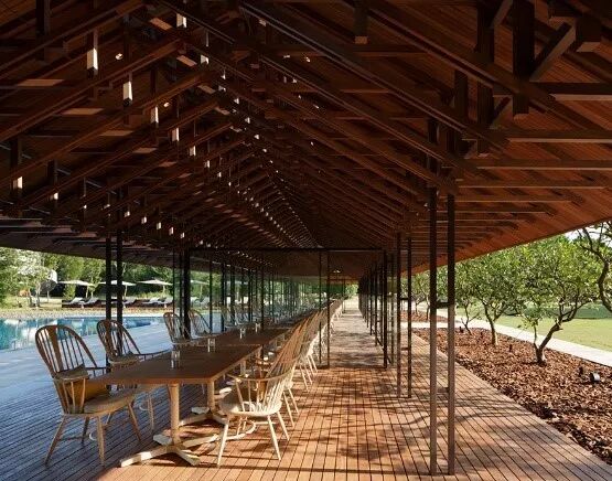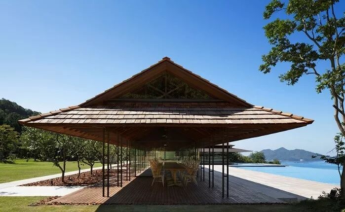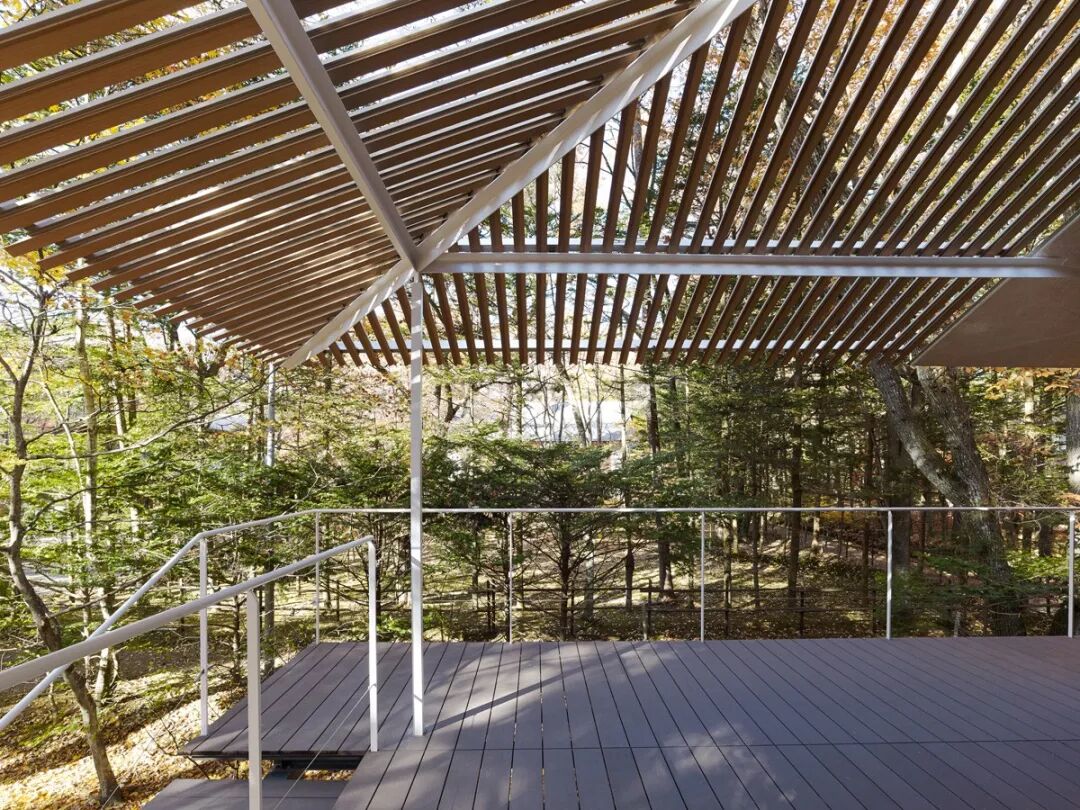 我们都希望“让柱子变细”,是因为我们只希望有屋顶提供遮蔽,而不希望有柱子遮挡视线。如果屋顶可以漂浮,那柱子的烦恼就没有了。将柱子隐藏,我们可以将其变细,或者将其融入环境。该设计中,这两点都做到了。