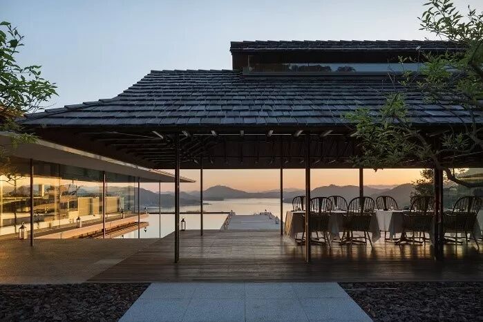 可能有人会问,为何屋顶不更加轻巧?这样不是更加有助于结构的消隐?可面对这样一个无边的海,一个过于轻薄的屋顶可能并不能为餐饮中的人提供足够的安全感。此时的屋顶不只是一个遮盖,更是为屋顶之下的人提供安心的一个“怀抱”。与此同时,当人面向大海走出餐厅,透过屋顶下的空间,大海的视野逐渐变得开阔,这样先抑后扬的感受在厚重的屋顶显得更加强烈。