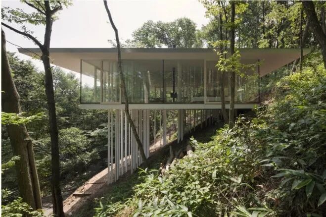 ‖李萌‖ 正如该建筑的名字“Extendto forest”,建筑师希望住户不只是生活在建筑之中,更像是生活在森林之中。大面积的玻璃窗可以帮助室内外实现很好的无隔断联系。试想如果此时设置600x600mm的混凝土柱,或是300x300mm的钢柱,再通透的玻璃也无法让人感觉自己与外界“无缝相接”。