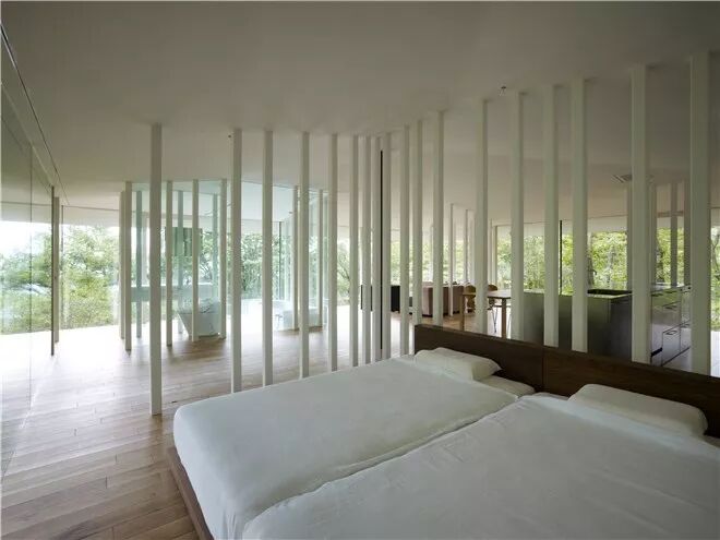用隔而不断的柱列既划分了各个功能空间的范围,同时又让各个空间有所联系,保留该建筑的空间整体性。更为有趣的是,细细的柱子向上支撑着屋顶,向下扎根于土地之中。这些柱子就如同周边环境的树一样,似乎从大地中“生长”出来。此时的住户不是生活在一个建筑之中,而是生活于枝桠之间,自然之中。同时,柱列中各柱的间距并不匀质相等,而是考虑了建筑的使用者---主人夫妇以及两条爱犬随意出入的可能。