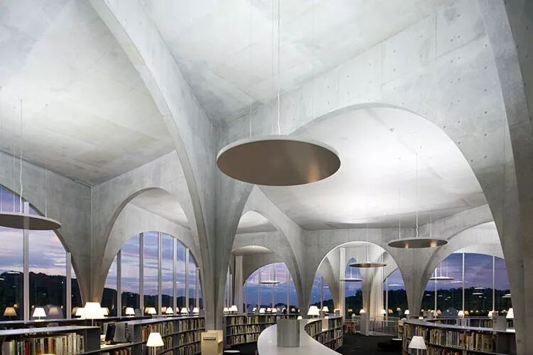 ‖李萌‖ 多摩美术大学图书馆现已成为不少建筑学生日本旅行中必不可少的打卡圣地。还记得当大家刚接触到伊东的这个作品之时,一段时间做拱门成了风尚。网格、灵活的平面、几何、空间的划分,这些词语在建筑学习过程中都是老伙伴了。可这个作品都给我们对这些干涩词语的全新理解。一系列简单的混凝土拱门组合形成平面的网格体系,将平面划分成一个个小空间。但拱门自身的开放性又让空间彼此相连。书架如流水一般穿过一个个空间,绕过一个个轻巧的柱脚。读者如乘着小船穿梭其间,悠游自在。