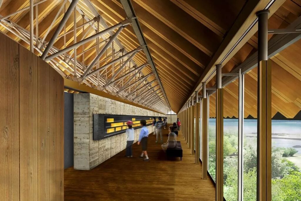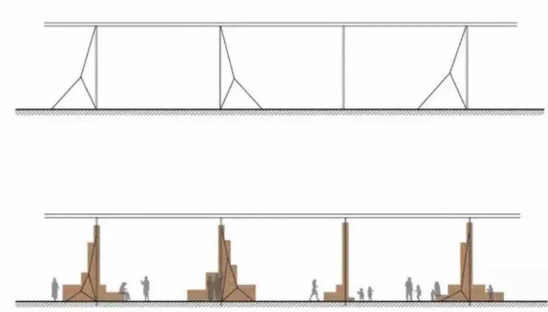 ‖刘康‖ 建筑平面为76mx9.6m的细长形,分上下两层。一层为开敞的空间+售票厅,二层为陈列展示的室内空间。整个建筑为混凝土、钢材和木材构成的混合结构。一层墩柱和二层楼面采用类似市政桥梁中常用的多跨连续预应力混凝土结构。屋面结构采用轻质柔和的木结构。屋面与二层混凝土墙墩之间采用钢制桁架连接。采用钢桁架相对于木桁架一方面可以减小构件截面尺寸,另一方面也可简化多根杆件汇交的节点处理,整体效果简洁、通透、有趣。