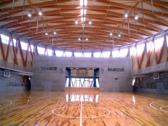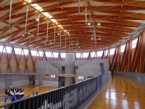 ‖刘康‖ 篮球场屋顶呈椭圆形,长向约43m,短向约67m。屋面结构为斜格张弦梁,受压的上弦使用木材,受拉的下弦采用钢索。木材轻质且受压性能优异,钢材密度虽大但拥有大多数材料无法企及的受拉性能。该屋顶结构充分利用两种材料的优点,在减轻结构自重的同时,也形成了极为高效的斜格张弦梁结构体系。上弦木料断面尺寸为1240x240mm,在43m的跨度下已经显得非常纤薄,同时细细的银灰色下弦拉棒在木料的底色里几乎消隐不见。