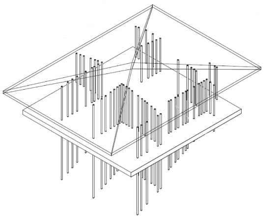 ‖刘康‖ KAIT工房总建筑面积为1990平方米,屋顶距地面4.5m。305根细长的钢柱分为42根承受压力的垂直柱和263根受拉柱。柱中的拉力通过预压和预变形引入。每根柱子都是细扁的长方体,最薄的受拉柱剖面尺寸16x145mm,最厚的垂直柱63x90mm。