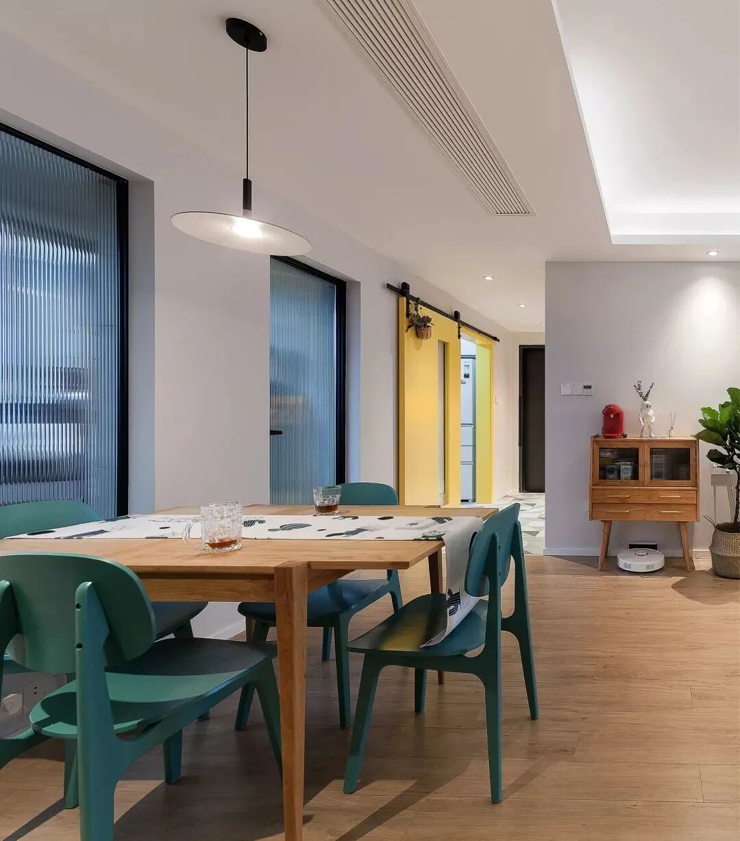 餐桌上的清新桌旗,还有上方一盏黑色的吊灯,整体也是显得温情自然。