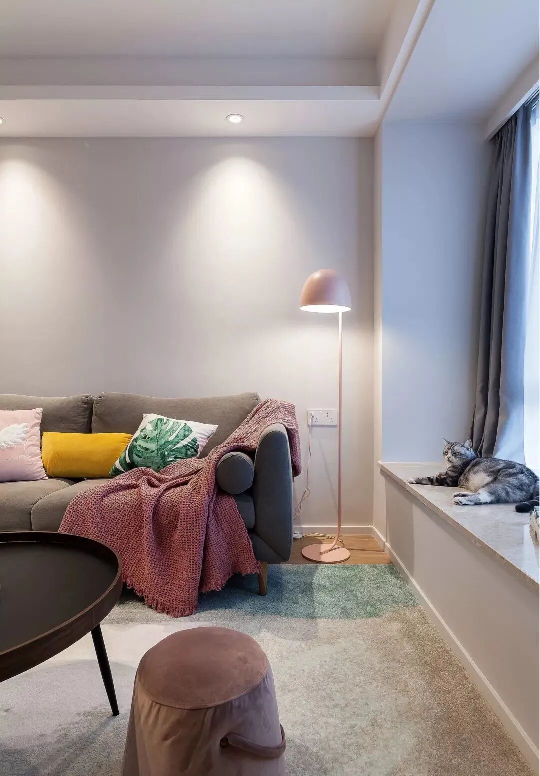 了整体浅灰色的空间,简洁的沙发墙上方装上两盏筒灯,结合一张灰色布艺沙发,角落一张淡粉色落地灯,再加上鲜艳活泼的软装细节,营造出一种闲适轻松的年轻氛围感。