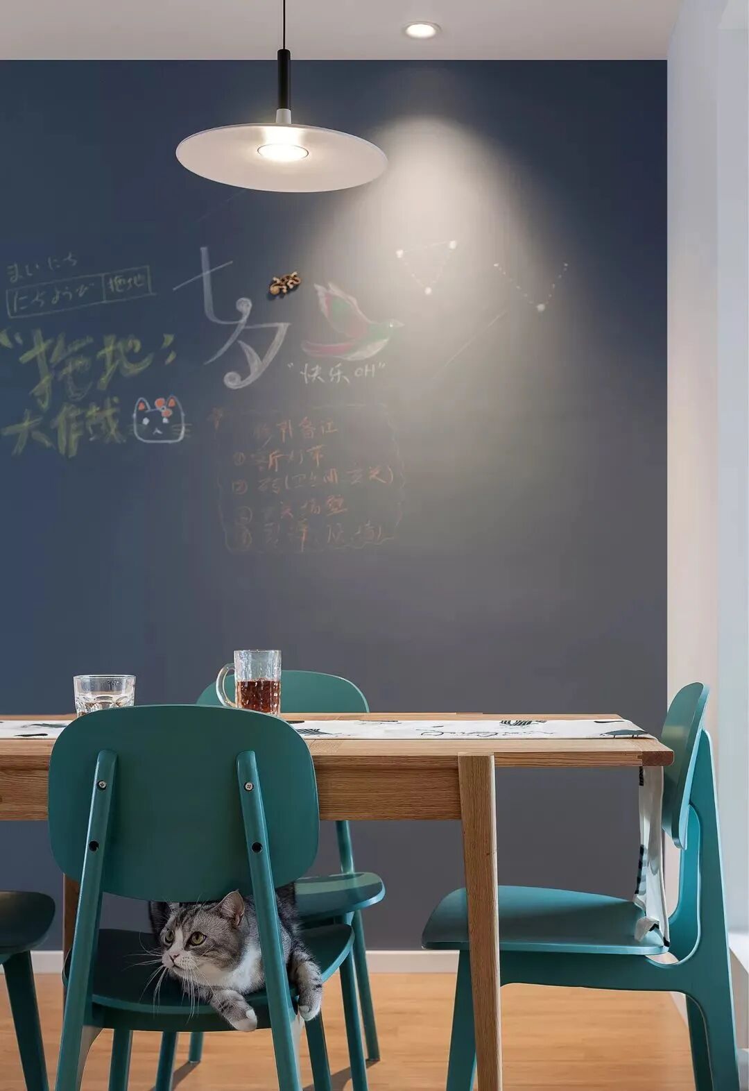 餐厅背景墙的黑板墙,根据不同的心情或时间写上不同的字画,描绘出一种充满情趣雅致的居家氛围感。