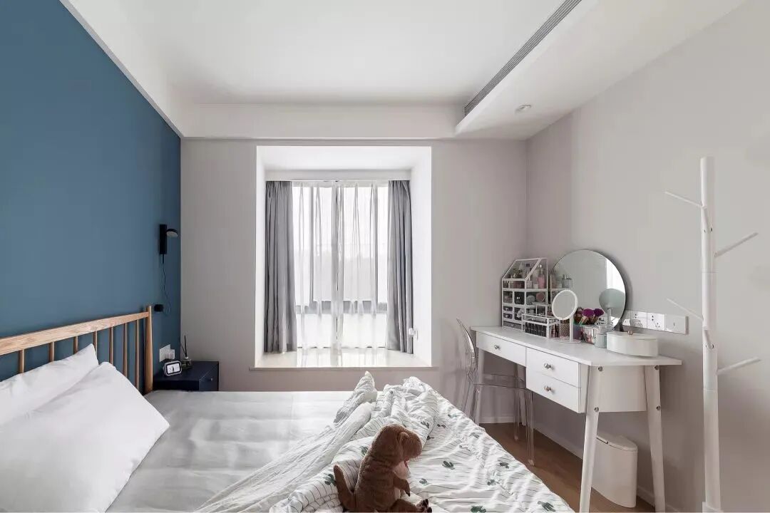 简洁舒适的卧室,床头墙是暗蓝色的,搭配一张实木床,床尾一张白色的梳妆台+挂衣架,布置出一种简雅实用的温馨感。
