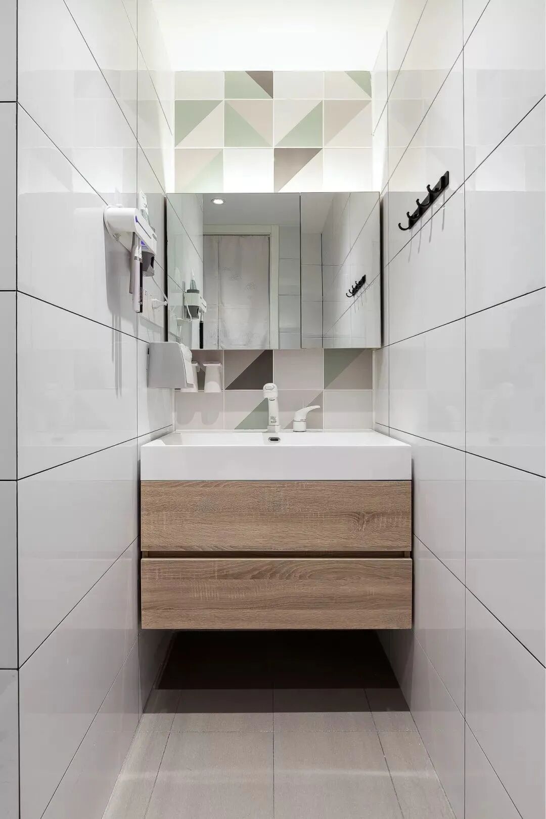 小户型只有一个卫生间,洗手盆设在过道区域,避免早上洗漱与如厕时的使用冲突,提升卫浴效率。