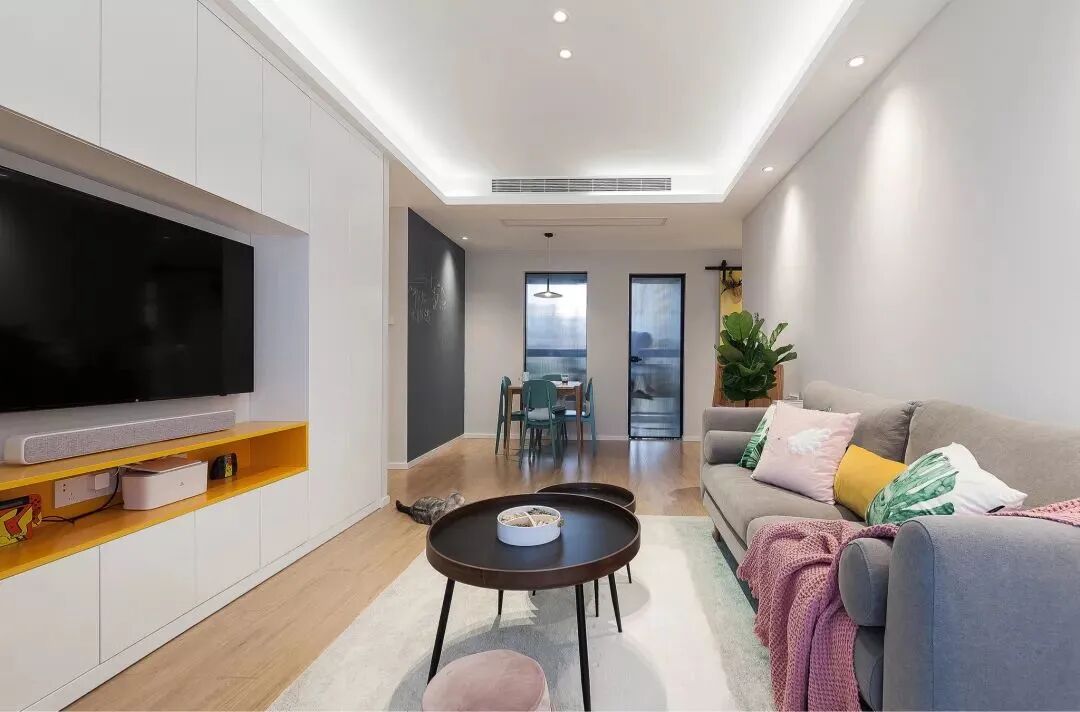 客厅的等个简洁舒适,没有多余的设计。电视墙是定制柜的设计,正面墙的柜子设计,在电视机下面加入了一排橙色的展示架,让整个客厅更加有层次。