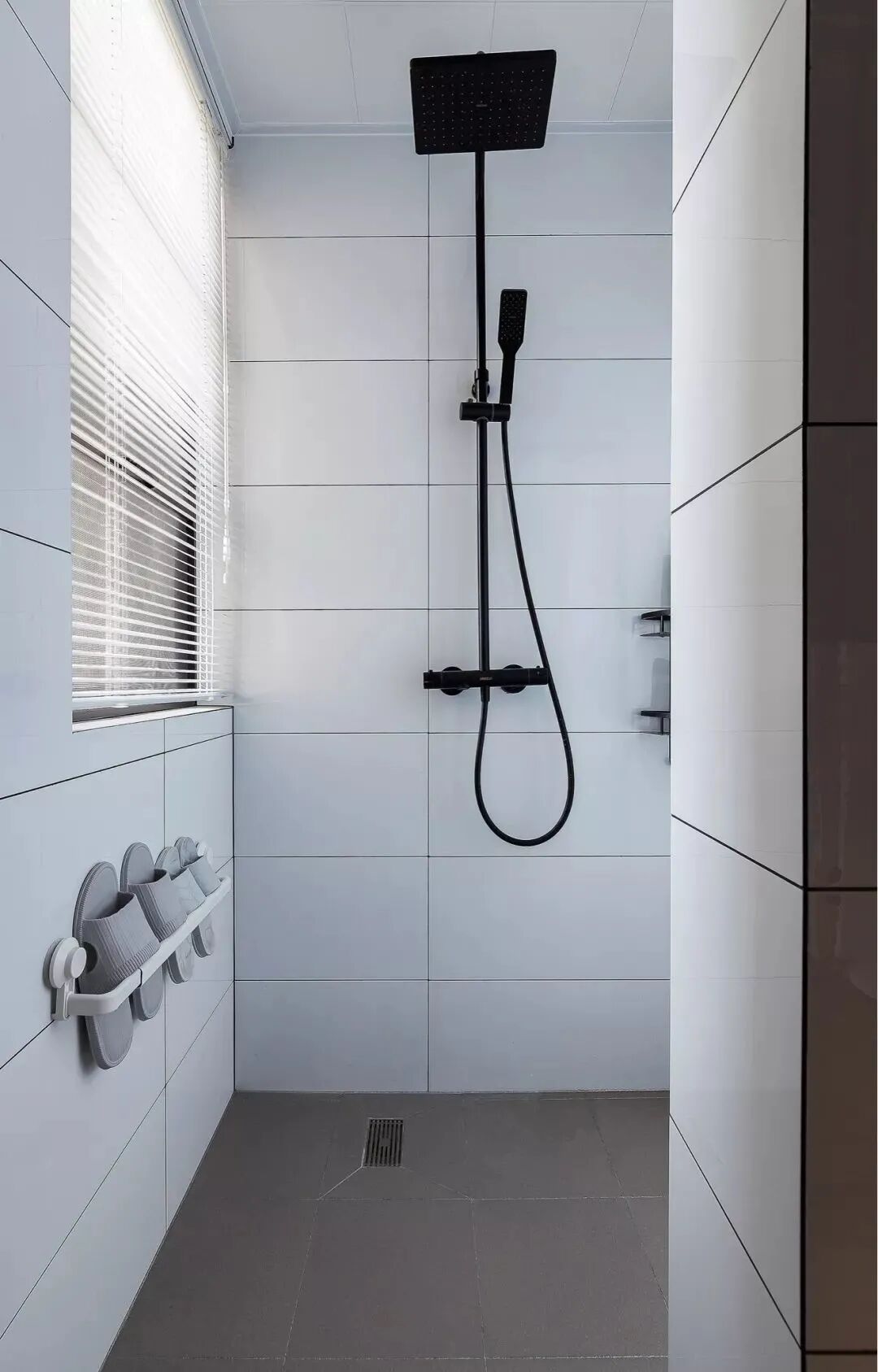 灰色地面砖基础,搭配白色墙面,营造出一种简约干净的卫浴氛围。