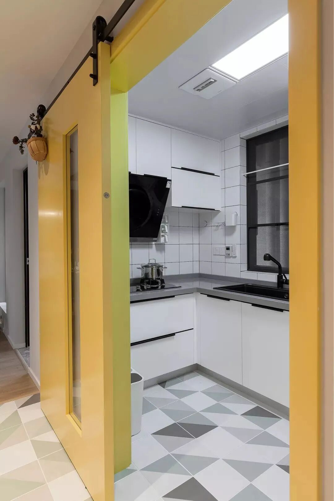 在玄关黄色的谷仓门后是厨房,U字形的操作台,整体白色的墙面与橱柜,结合灰色的操作台,整个现代简洁而时尚。