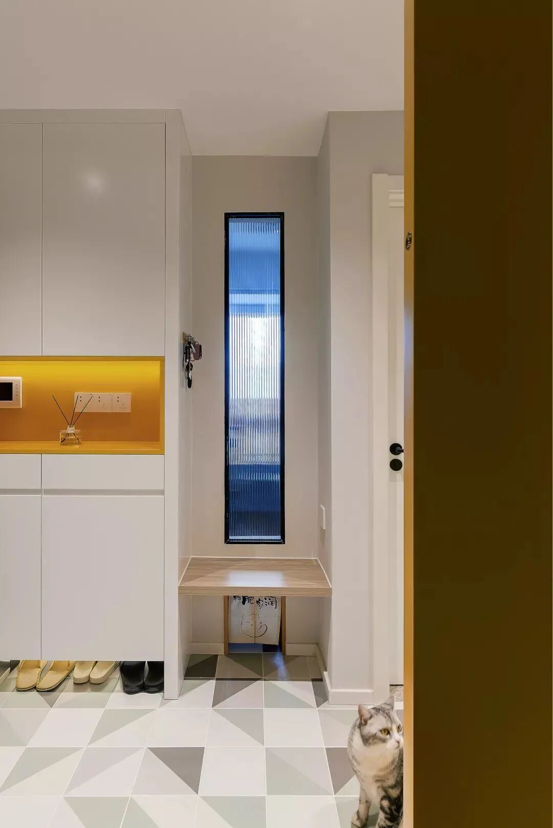 入户玄关是一个小走廊的形式,地面铺上黑白青色的花砖,搭配黑色的入户门,左边是一个黄色的谷仓门,右边是入墙式的玄关柜,空间留空的设计,让整个空间显得文艺精致且很实用。