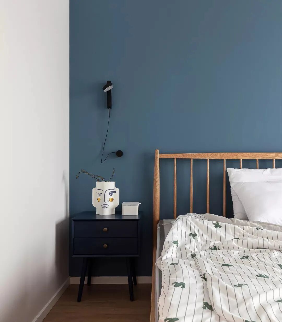 暗蓝色的床头背景,边上黑色的床头柜与壁灯,整体都是显得格外的端庄安静。