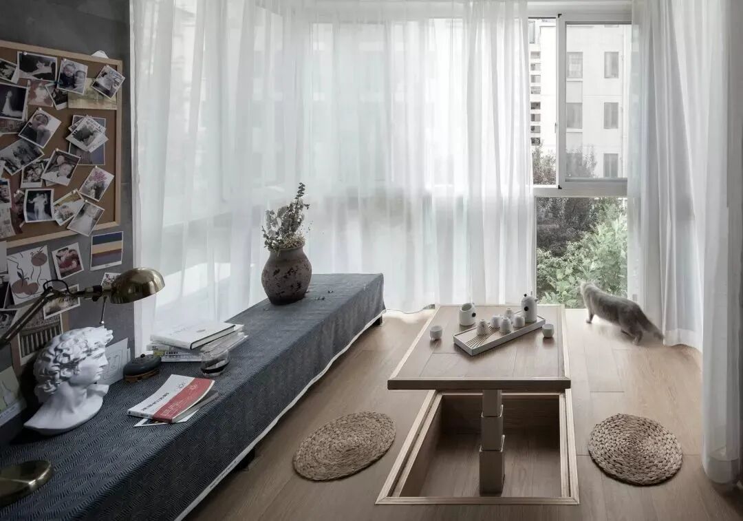 阳台采用了地台抬高设计。三用:休闲、晾晒,小猫二胡的活动空间。拱门设计让空间更柔和,文艺范。