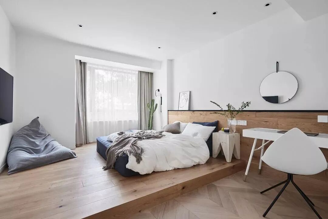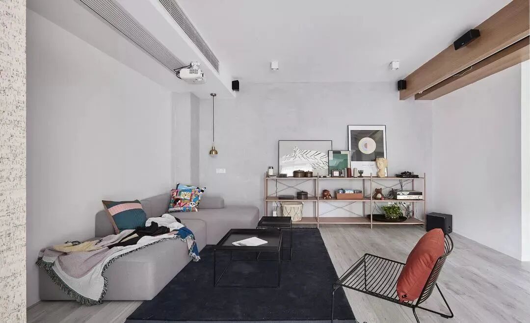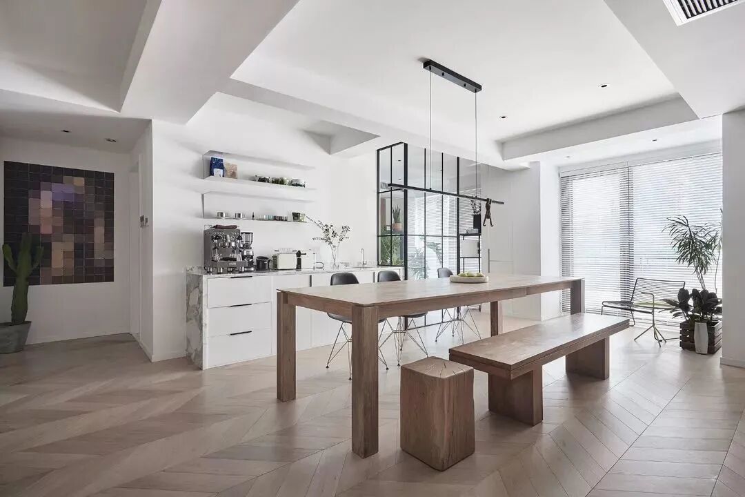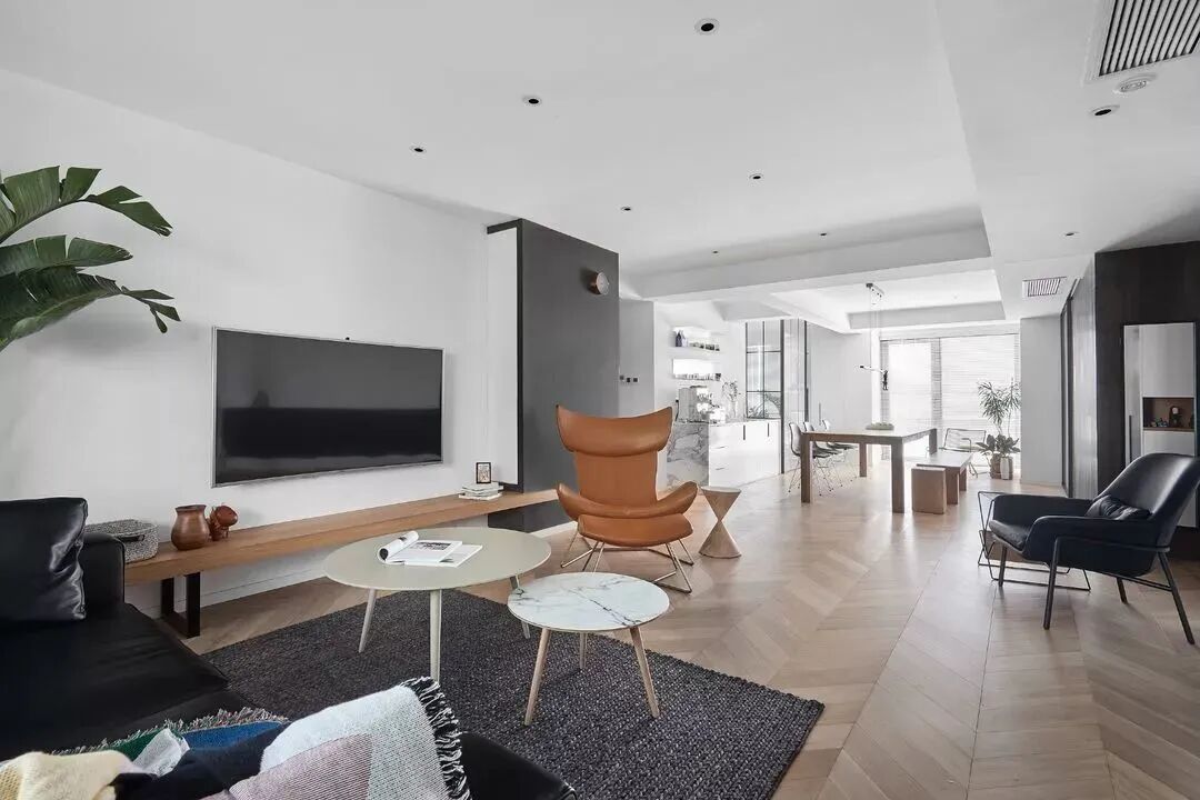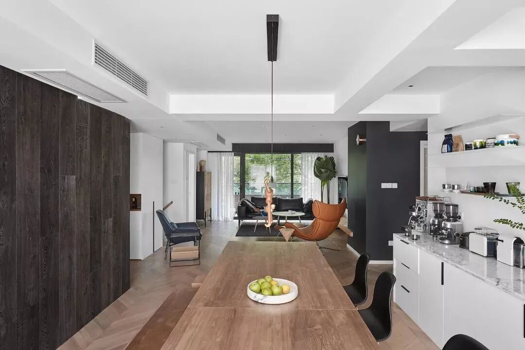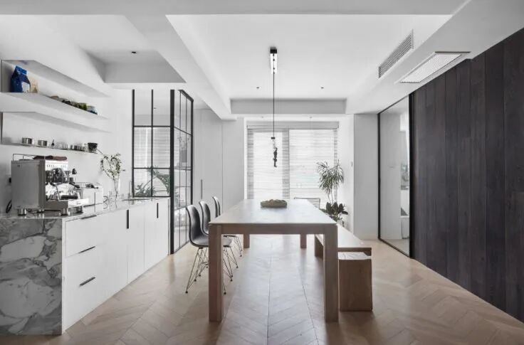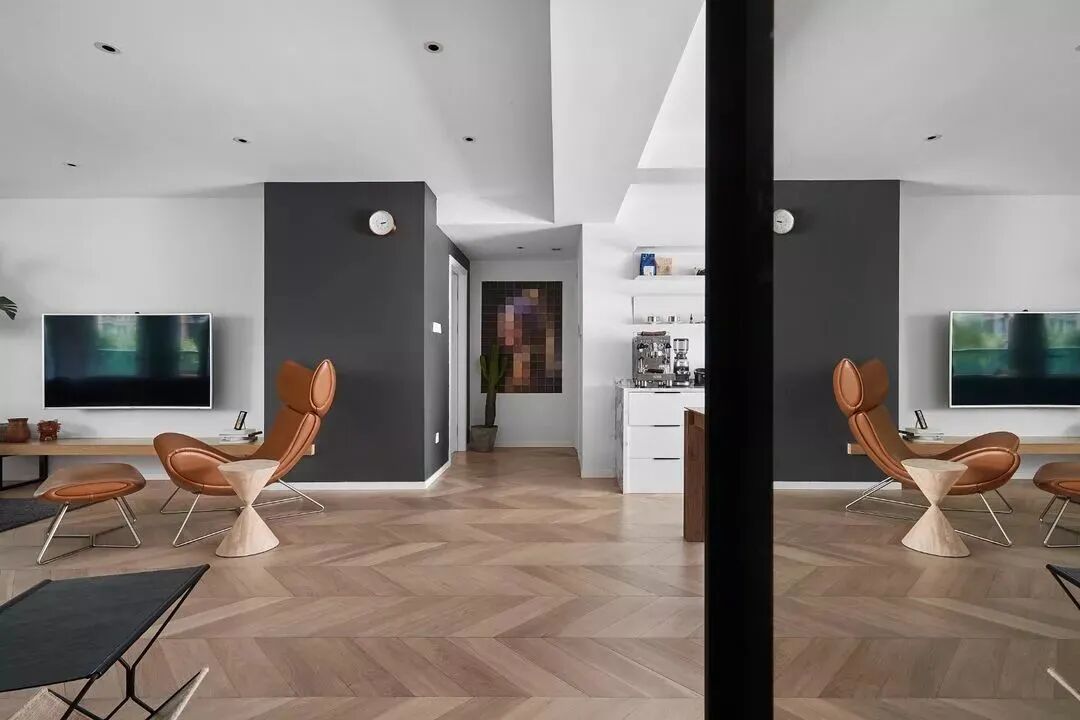 黑白对立下,木饰面与鱼骨地板,营造纯粹的美好
