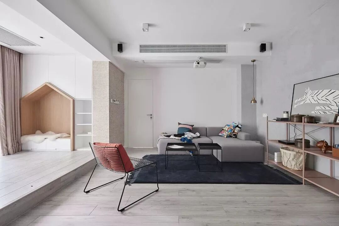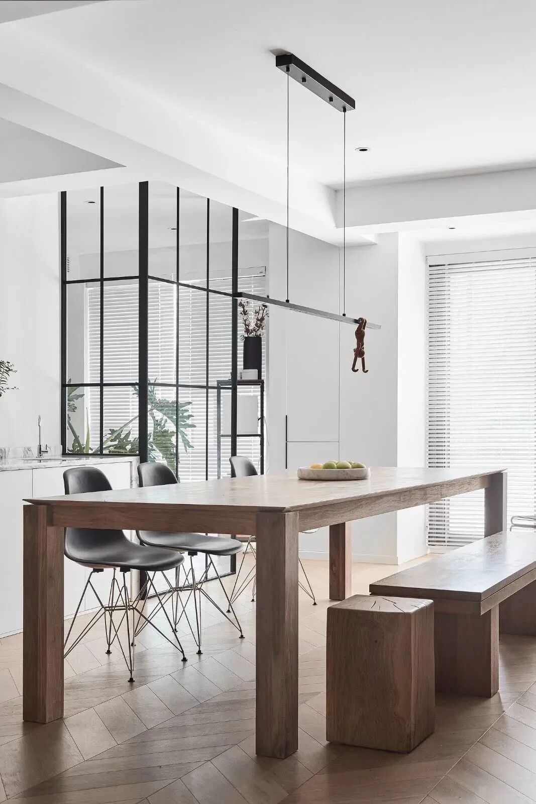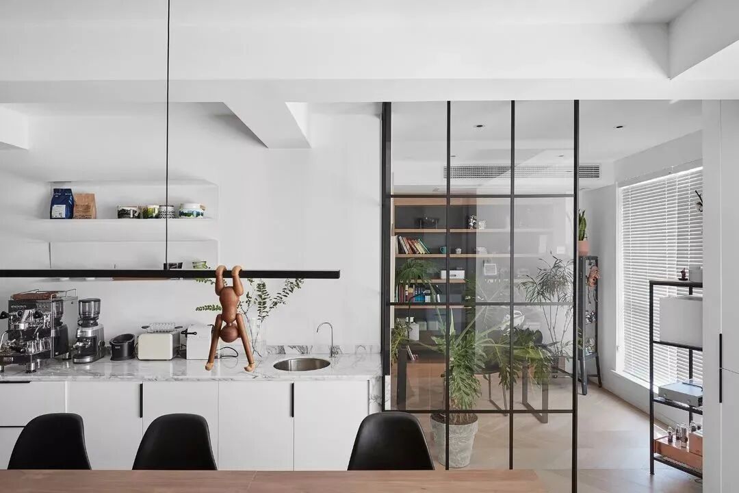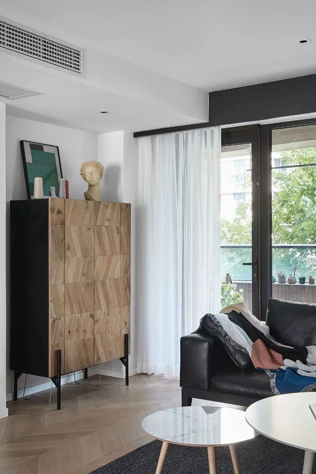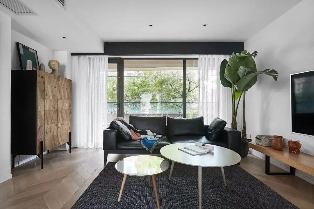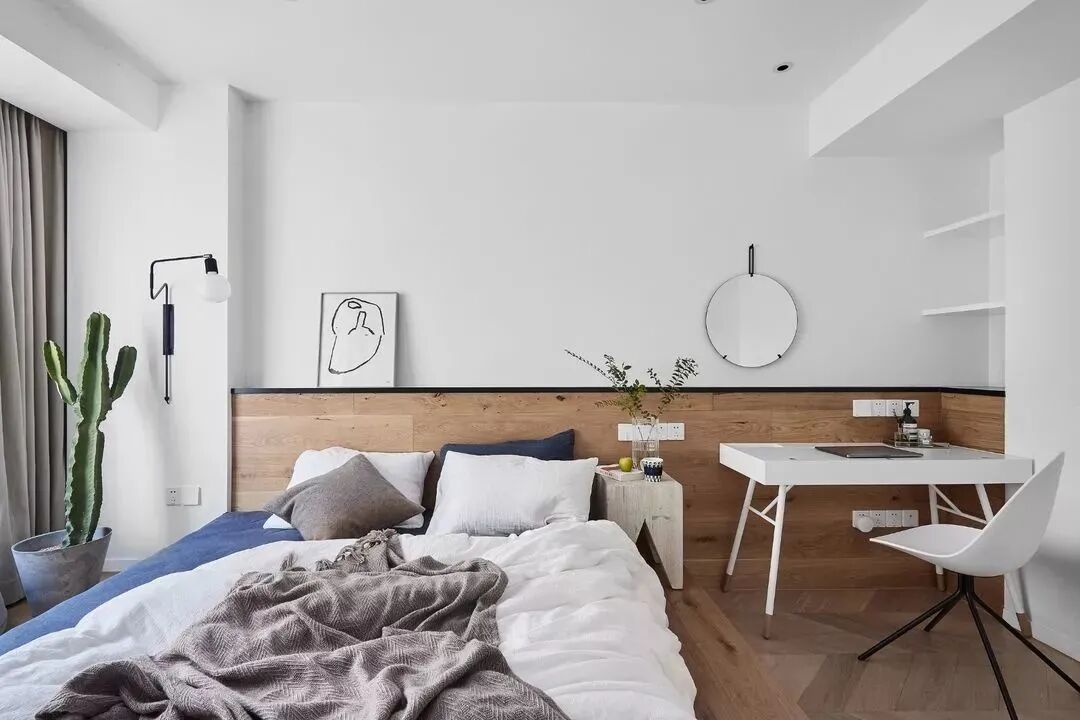 黑白对立下,木饰面与鱼骨地板,营造纯粹的美好