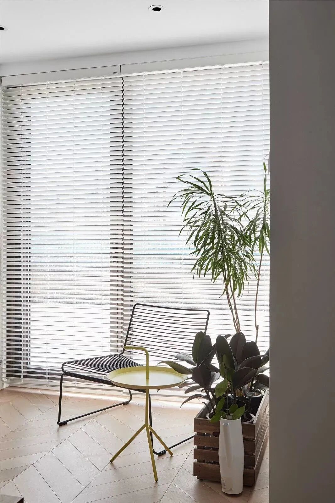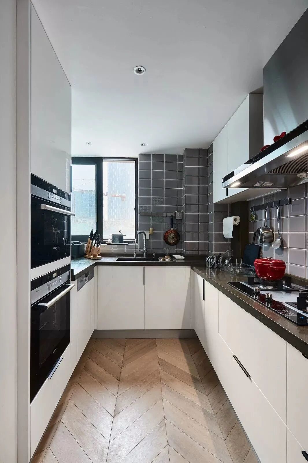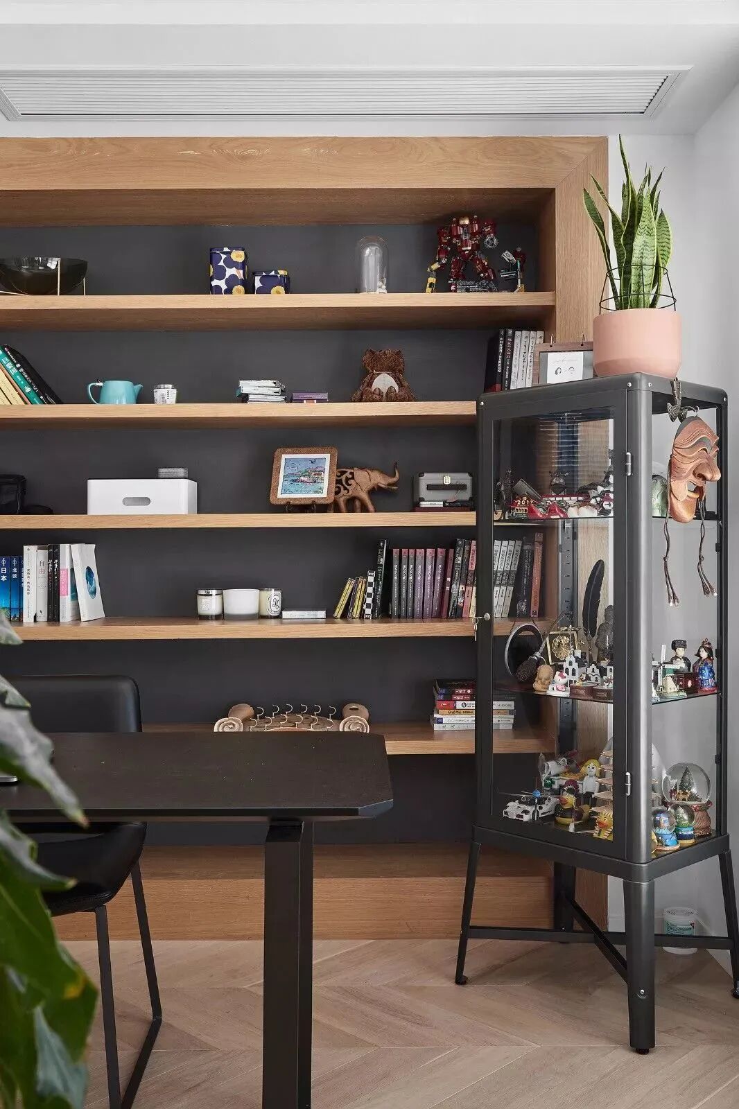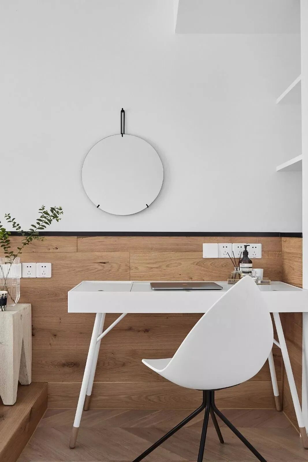 黑白对立下,木饰面与鱼骨地板,营造纯粹的美好