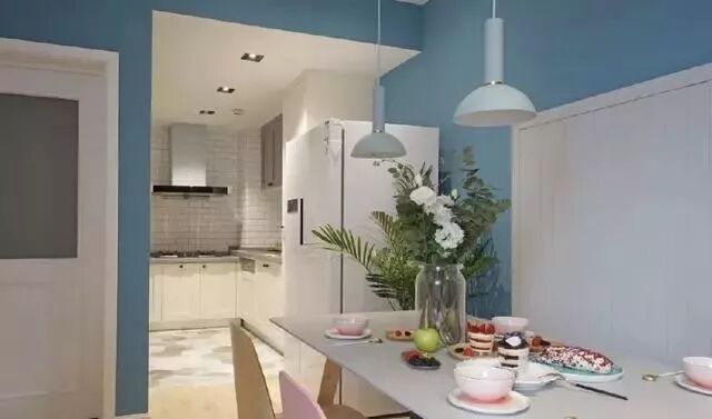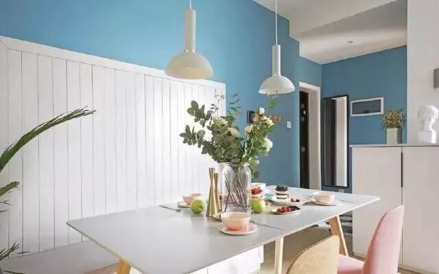 餐厅半卡座设计,节省空间利器,蓝白墙面搭配也很美。
