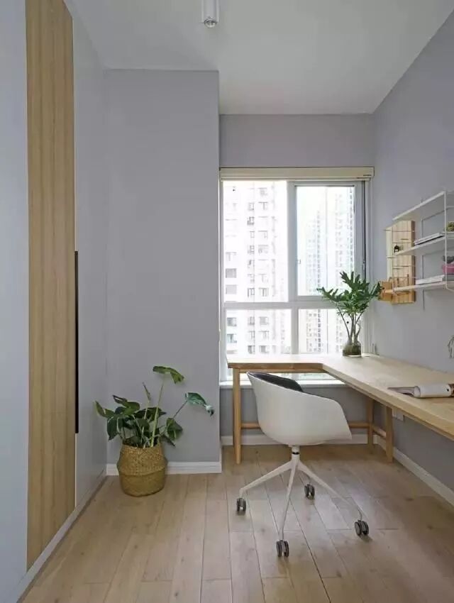 次卧不住人,设置为工作间,两米长大书桌完全满足了两个人的办公需求,后方设置收纳柜满足储物需求。