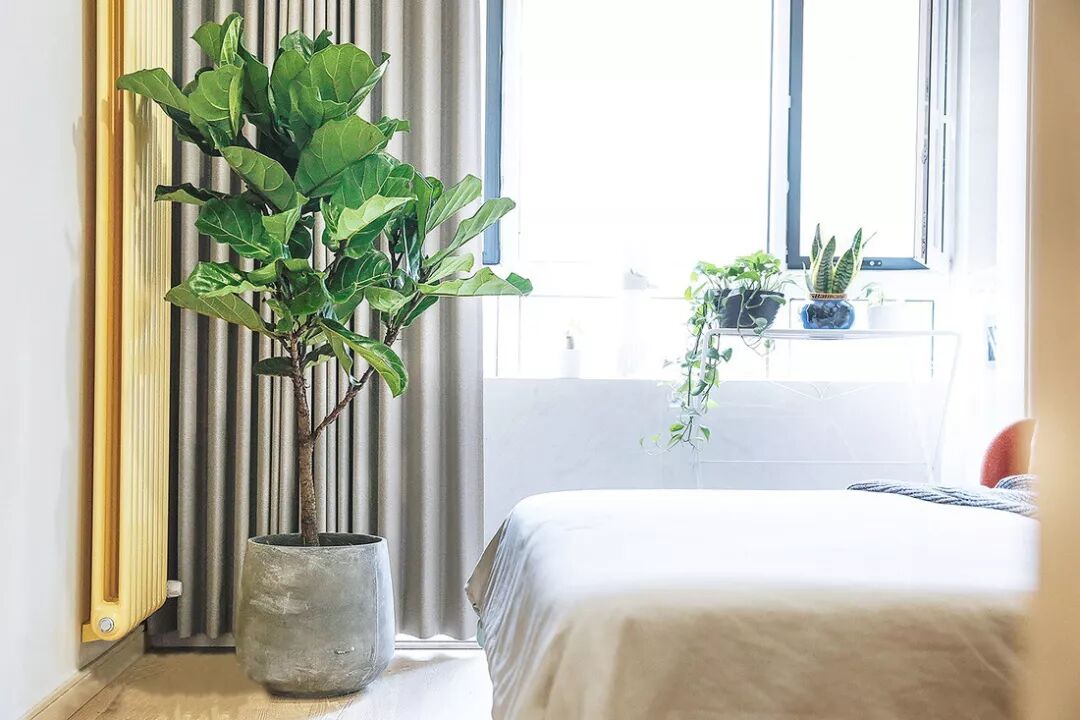 ▲ 未设置传统的床头柜,而是用简易的小支架搭配小盆绿植,别有一番美感。