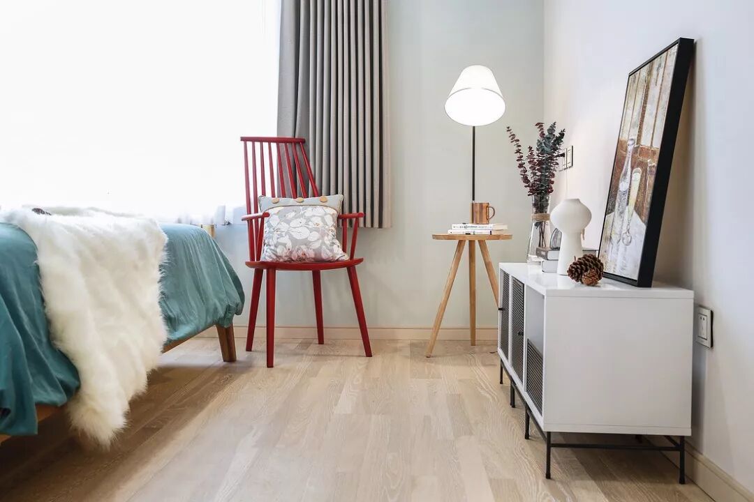 ▲ 主卧风格清新雅致,嵌入式的衣柜选用了造型古朴的谷仓门,红色沙发复古气息十足,颜值爆表,搭配上方的床头灯,满满的时尚感,营造超有格调的阅读区。