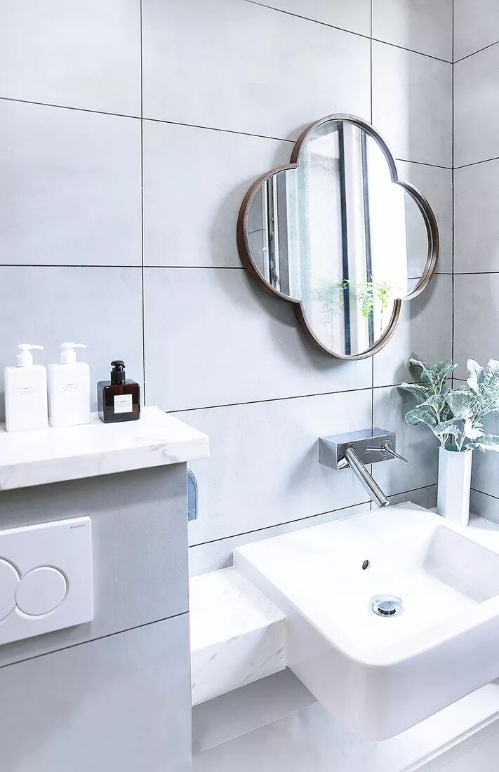 ▲ 卫生间以灰白色搭配,简洁不失格调。镜子造型优雅别致,角落放一株绿植,增添清新的味道。