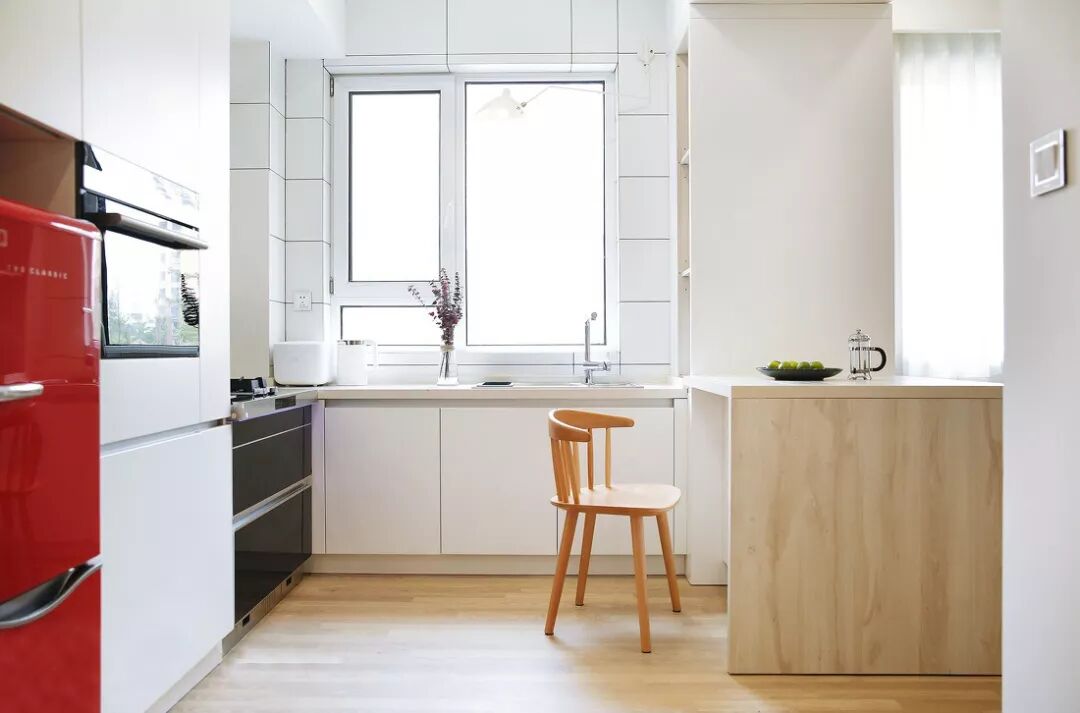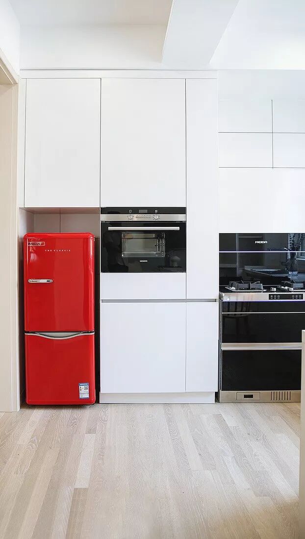 ▲ 纯白空间里,冰箱的一抹亮丽的红让人猝不及防,惊艳十足。嵌入式的设计整齐利落,大写的赞。