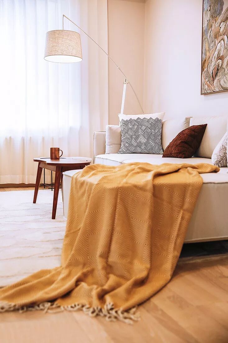 ▲ 素色的布艺沙发上,温暖的黄色毛毯随意一搭,提亮空间的同时增添了生活气息。一角的落地灯造型独特,线条流畅,使空间更具视觉感与层次感。