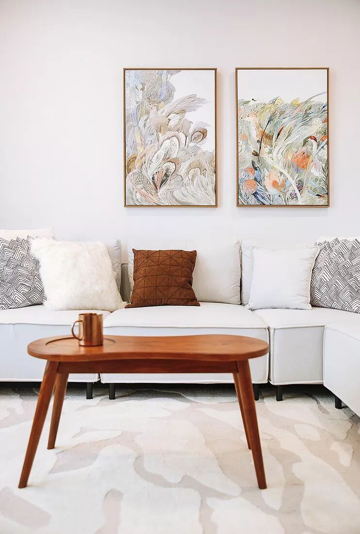 ▲ 几何图案的抱枕进行点缀,使舒适的沙发区不再单调。咖色抱枕质感满满,与小茶几相呼应。沙发背景墙以两幅极具艺术气息的挂画进行装饰,大大提升空间格调与品位。