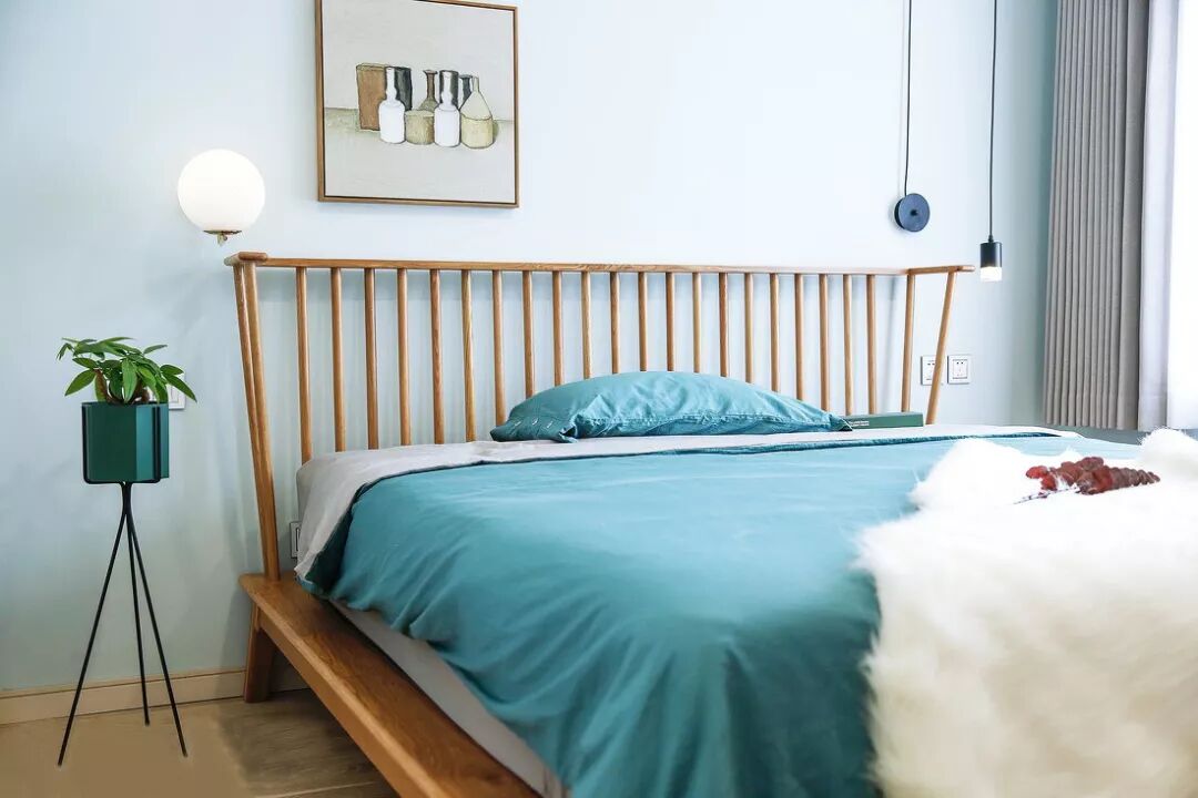 ▲ 次卧以蓝色为主色调,扑面而来一份舒适感。床头线条简洁利落,使空间更具层次感。