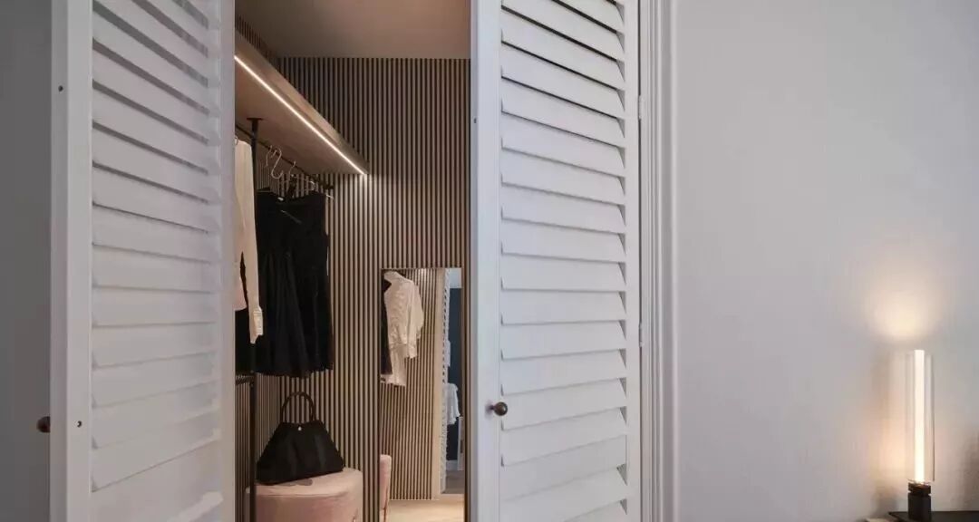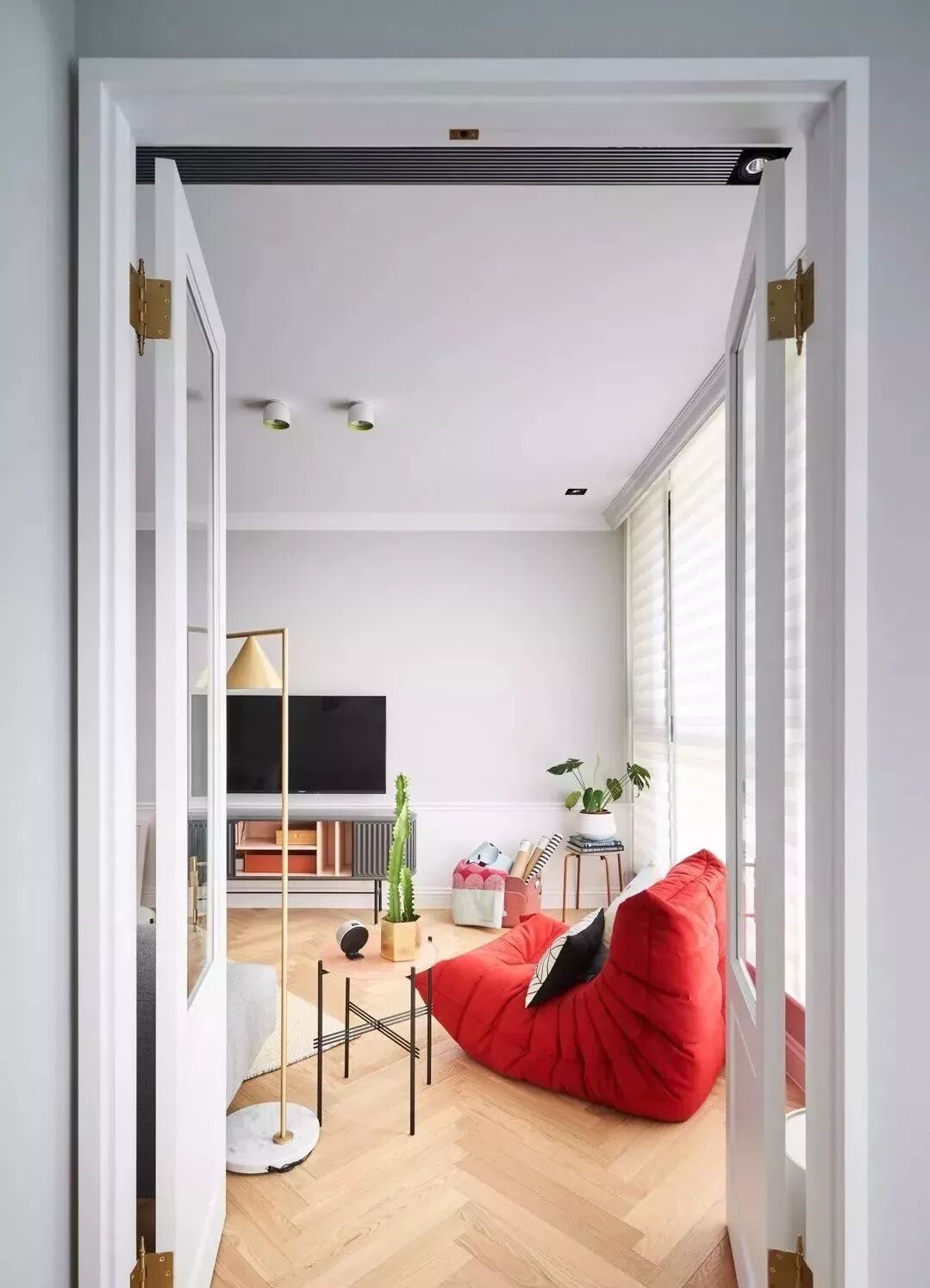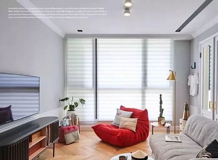 铺满全室的人字拼木地板散发舒适温润气息,浅灰色和白色乳胶漆筑起舒适静谧的空间调性。调光卷帘调节空间采光,整体明亮、干净且清爽。
