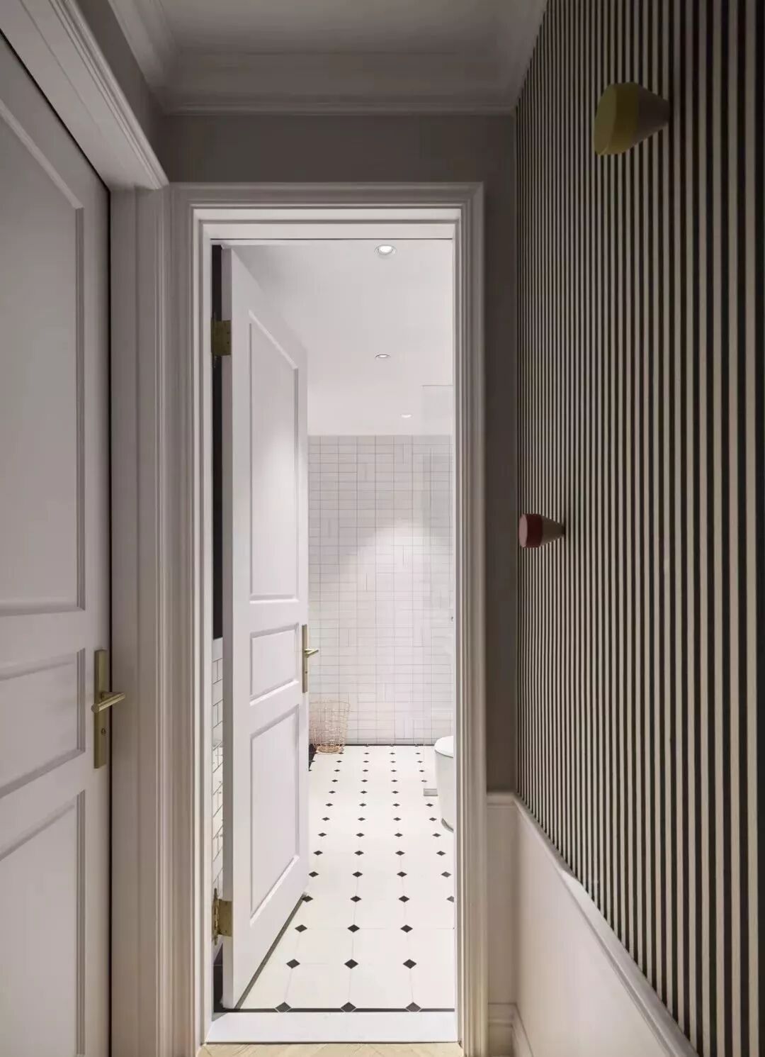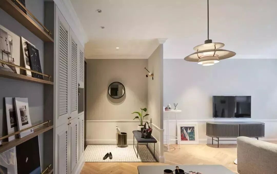 进门的玄关区选用了编织造型的马赛克磁砖与地板完美拼接。配上换鞋凳,还有伞桶和一面圆镜,独特造型的壁灯点亮空间,简单却不失质感。