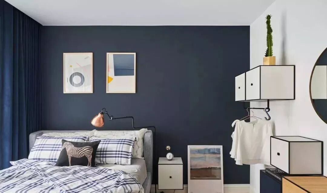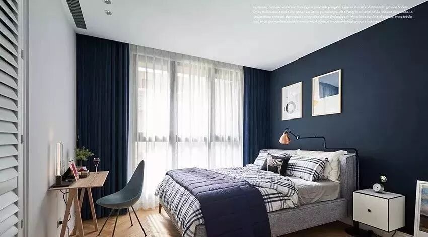 卧房颜色定调为蓝色,蓝色窗帘、蓝色油漆的床头墙搭配北欧风格的床单,藉由同色系搭配才能让空间整体呈现一致的协调性。