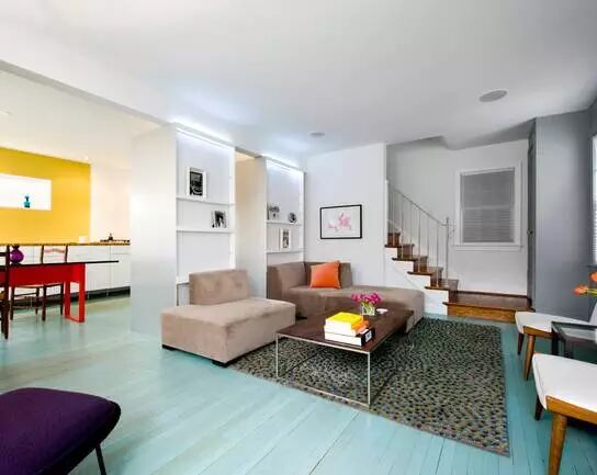 蓝绿色的地板,大胆的配色,彰显出这个家的个性。