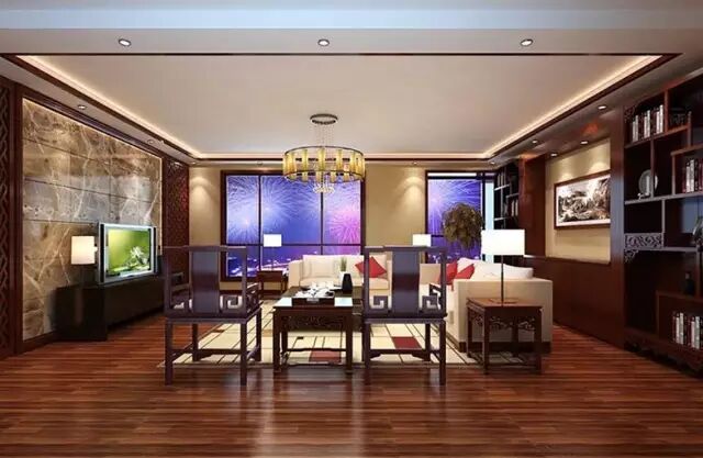▲ 红色亮面地板,搭配明清中式风格可谓相得益彰,而在中国风水上,讲究四平八稳,地面铺贴上要求,运图平坦,所以红木系地板是明清中式的不二选择。