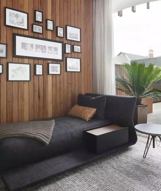 ▼ 背景墙和地面(顶面)均使用相同的木地板,由于色调和纹理都相同,整体给人一种浑然天成的感觉,非常具有艺术性。
